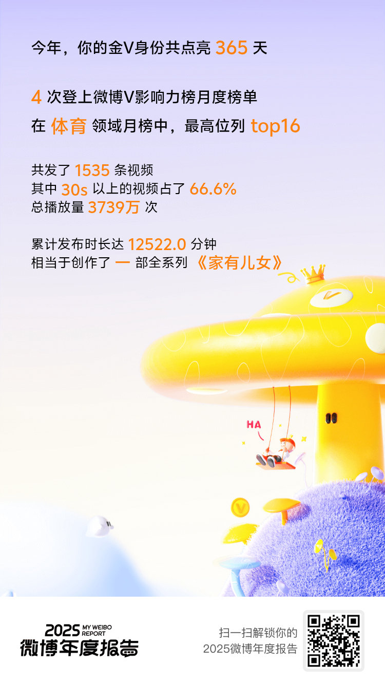 微博年度报告创作成就已解锁:2025年,我成功维持金V成就365天感谢所有小伙伴的支持,新一年继续一起冲!快来>>2025微博年度报告 一键生成你的年度报告吧!微博之夜