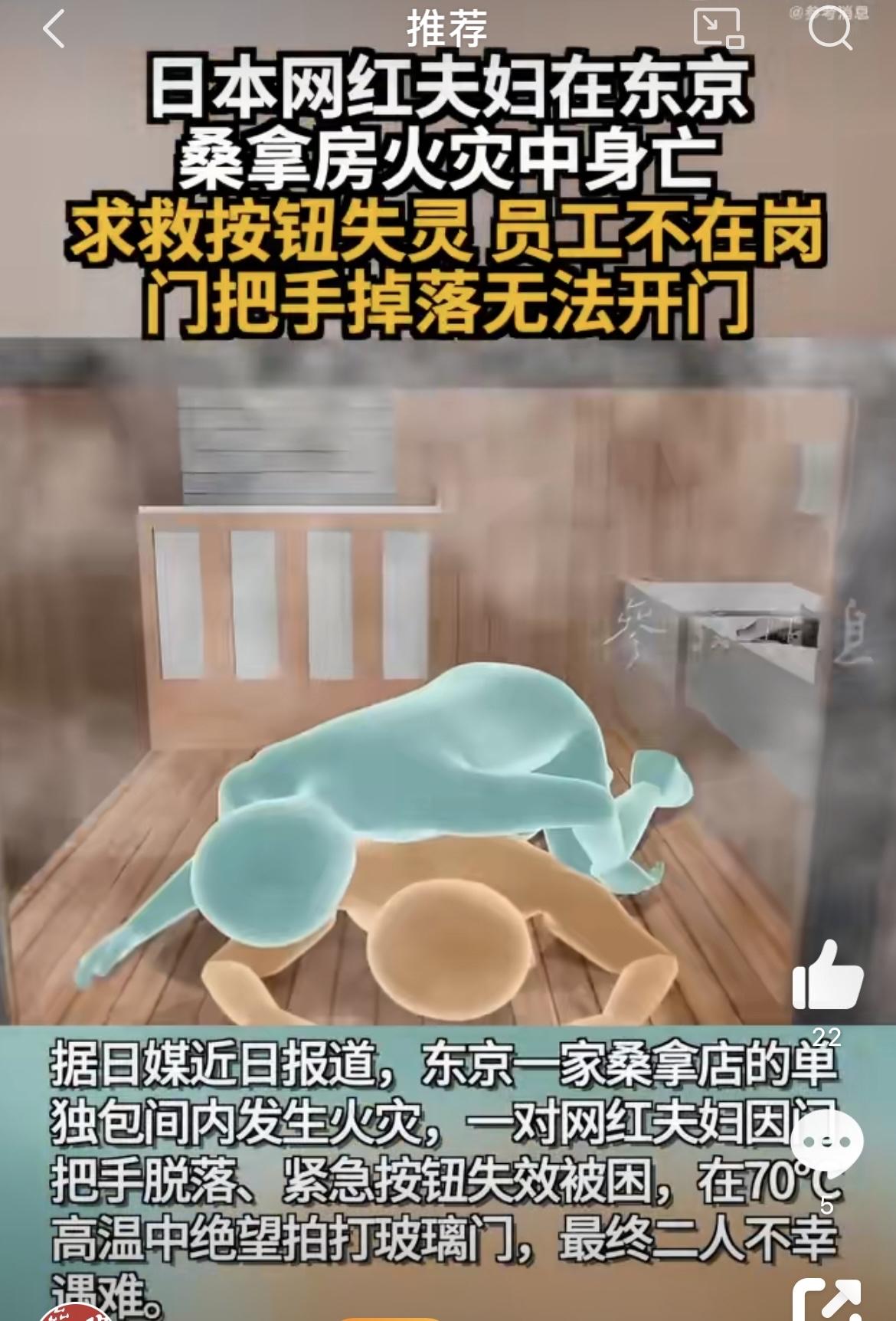 一对网红夫妇在东京一家高级桑拿房里,活活被困在高温房间里,最后不幸身亡。这事儿听