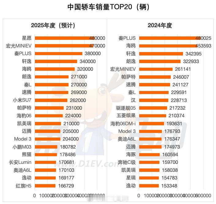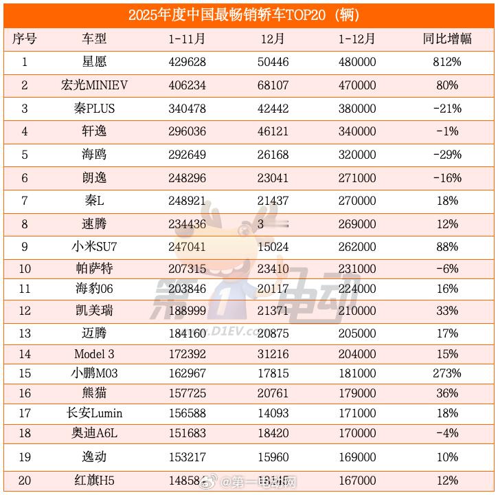 2025 年中国轿车市场,是真的变了新能源汽车销量轿车销量 从年度最畅销轿车 TOP20 来看:新能源登顶,自主领跑,合资被迫防守。 几个关键变化——① 冠亚军易主,微小型新能源登顶吉利星愿、宏光 MINIEV 包揽年度前二,新能源车型在 TOP20 中占 11 席、61% 销量占比。价格不高、使用成本低、精准命中通勤与家庭增购,成了真正的“基本盘”。② 新势力第一次站上轿车主舞台小米 SU7 年销约 26 万辆,直接杀进年度前十;小米SU7 小鹏Mona M03 同比暴涨 272%,靠“智驾下放”突围。小鹏mona m03 这是新势力首次在年度轿车榜单中形成存在感。③ 合资燃油车仍在,但已是“结构性坚守”轩逸、朗逸、速腾还在前列,但整体份额持续下滑;凯美瑞成为少见亮点,同比 +33%,靠的是混动省油 + 价格下探。一句话:能卖,但不再主导。④ 价格带已经被新能源彻底改写热销车型高度集中在 5–15 万元,15–20 万区间,电车销量已反超同级燃油车。这不是趋势,是结果。如果用一句话总结 2025:轿车市场,已经从“合资时代”正式切换到“自主新能源时代”。而 2026 年,洗牌只会更快。全文请戳:网页链接