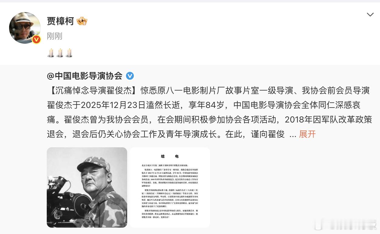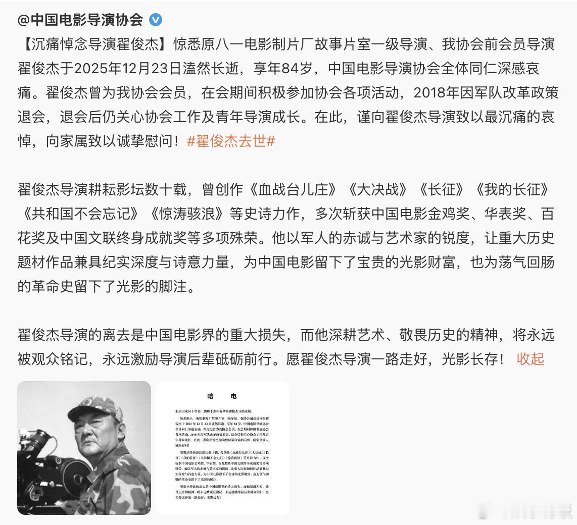 贾樟柯悼念翟俊杰中国电影导演协会悼念翟俊杰 著名导演翟俊杰于2025年12月23日溘然长逝,享年84岁。24日,等业内发博悼念翟俊杰。