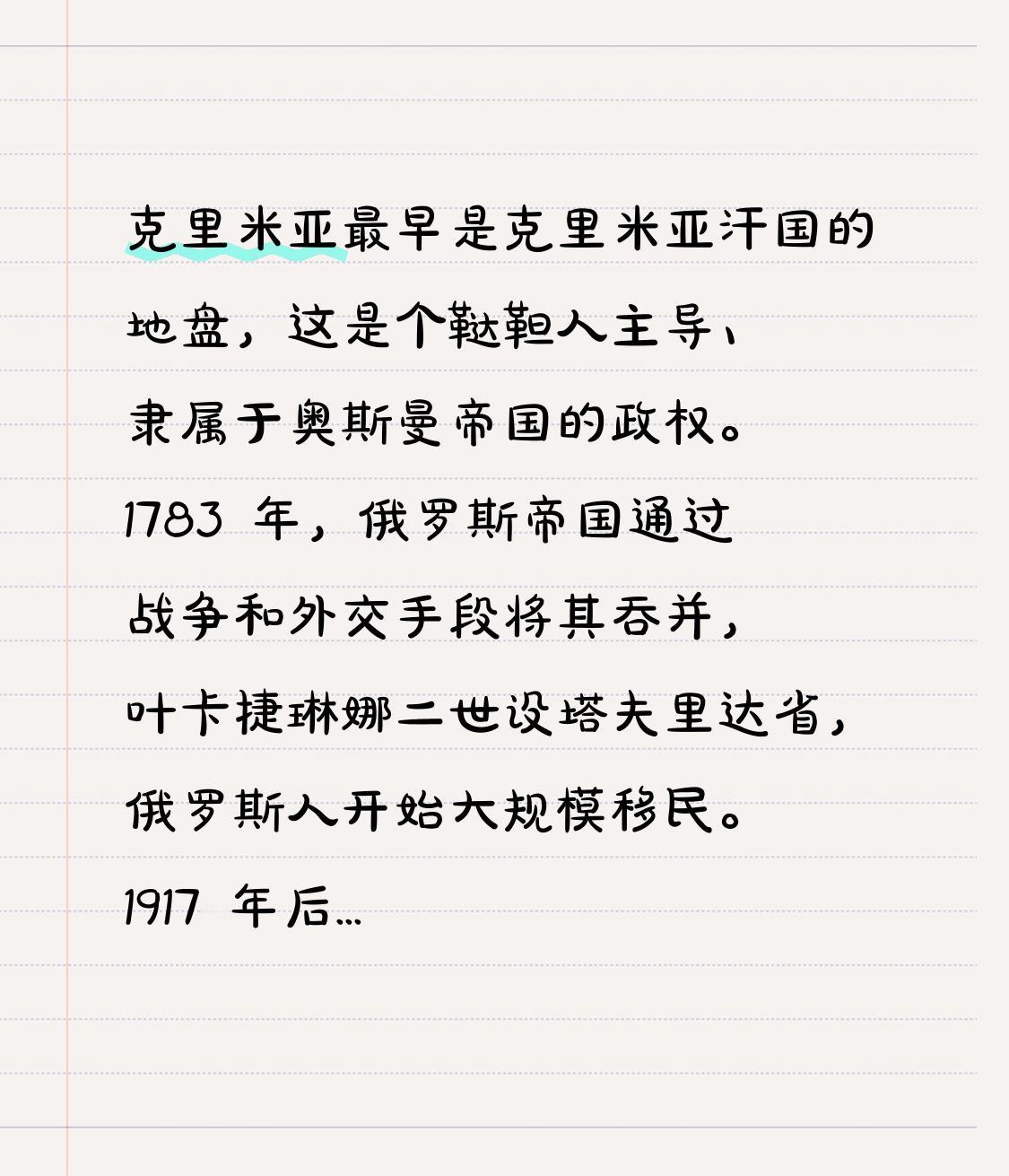 克里米亚最早是克里米亚汗国的地盘,这是个鞑靼人主导、隶属于奥斯曼帝国的政权。1783 年,俄罗斯帝国通过战争和外交手段将其吞并,叶卡捷琳娜二世设塔夫里达省,俄罗斯人开始大规模移民。 1917 年后,克里米亚历经短暂独立又被布尔什维克控制,1921 年成为自治共和国隶属俄罗斯。1954 年,赫鲁晓夫推动将克里米亚从俄罗斯划给乌克兰,说是纪念乌加入俄 300 周年,实则考虑经济管理和地理便利。苏联解体后,克里米亚虽留在乌克兰,但当地俄罗斯人占多数,有自治倾向,乌克兰政府一系列不当操作,激化了矛盾。