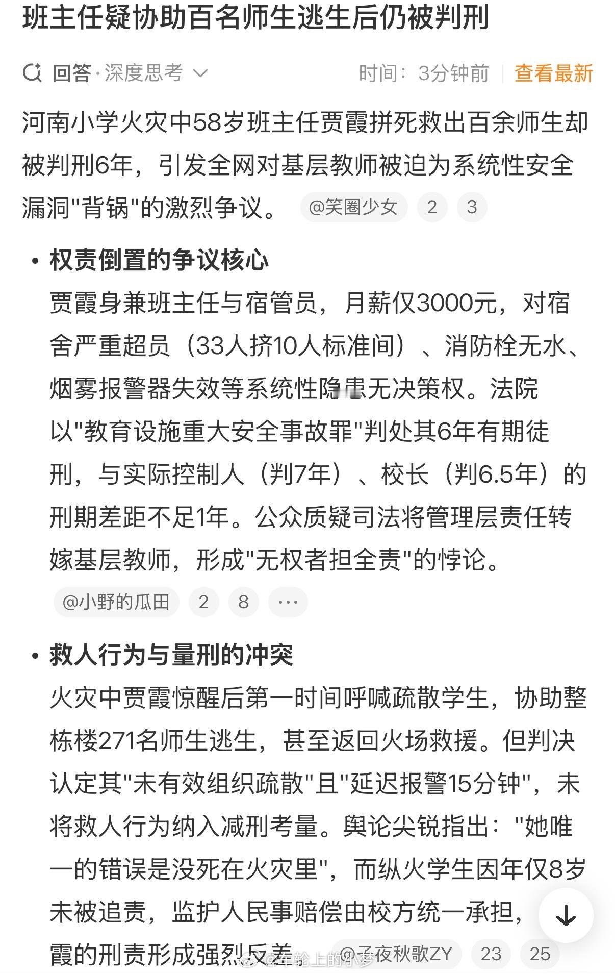 她唯一的错误,是没有死在火灾里……班主任疑协助百名师生逃生后仍被判刑这起案件真正令人不安的,并不是某个人的命运,而是………………当系统漏洞的代价,被持续转嫁给一线执行者当“多干多错、救人也可能坐牢”成为共识,基层教师还敢不敢主动作为?如果问责不能逼迫权力回到该承担责任的位置,而只让最弱的一环付出最高代价,那么下一次危险来临时,被伤害的,可能不只是一个人,而是整个校园。。。。