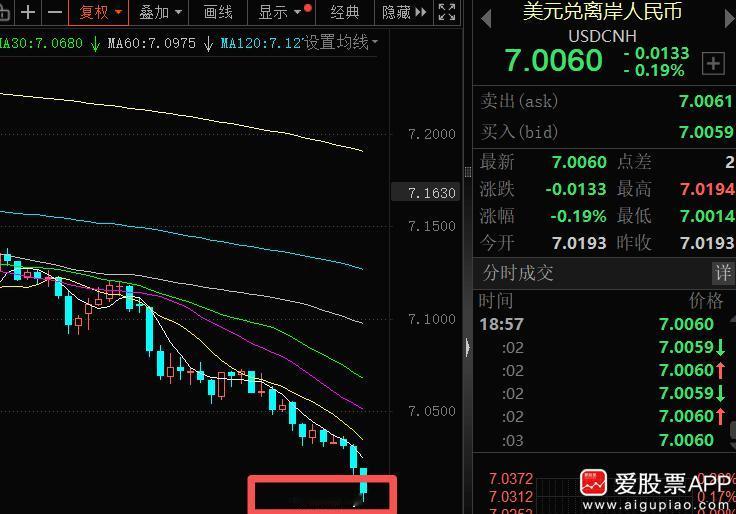 今天离岸人民币险些破7了,差点搞出个大新闻啊! 人民币一旦破7%,肯定铺天盖地各种吹的,人民币升值方向值得大家关注: 1、一是进口原材料的行业,造纸、油气(石油化工)、铁矿石(钢铁)。 2、进口消费品(卖奢侈品、化妆品这些)。 3、旅游航空(个人出境游,海外购物)。 另外对A股、港股也是比较大的利好,一旦破7,大A很快会冲上4000点的!