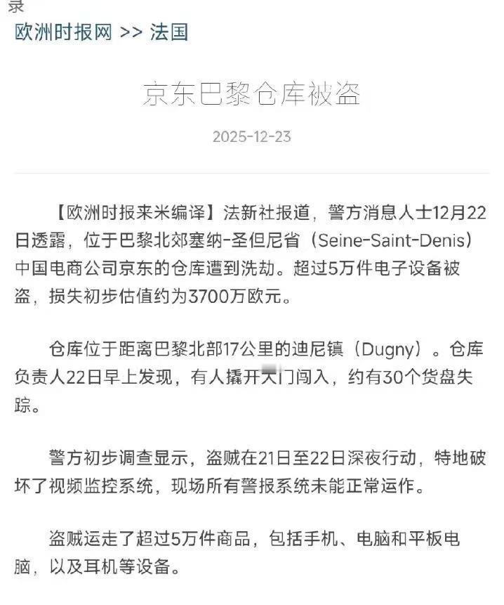 别以为南京的导航失灵只是卫星信号不好,那是一场真实的“电子战预演”。当我们在直播间里看热闹时,对手正在测试如何瘫痪一座城市的神经中枢。正如你所言,看不见的对手最致命。这是一场没有硝烟的“灰度战争”,敌人不再试图攻破我们的长城,而是试图从内部关掉我们的电闸,毒害我们的水源。 2025年12月22日清晨,巴黎北郊迪尼市的京东仓库员工推开大门时,浑身的寒意比冬日的寒风更刺骨。原本码放整齐的30个托盘不翼而飞,地上只散落着零星的包装碎屑,空气中残留着金属撬动的异味。仓库的几道防护门没有暴力破拆的凌乱痕迹,铰链是被专业工具精准拆解的;监控摄像头全被损毁,服务器要么断电要么遭破坏,全程没留下一点影像证据!红外报警和震动传感器像被按了静音键,从窃贼潜入到撤离,没有发出任何警报。 没人能想到,这伙人只用3小时就完成了整套操作。他们驾驶3辆伪造京东物流车牌的冷链货车,直奔高价值货区,50456件荣耀、OPPO的旗舰手机和电脑被一扫而空,连配套耳机都没落下。更让人脊背发凉的是,他们带着RFID写入器,篡改了货物标签,让仓库管理系统误以为这些货品是“正常出库”,堂而皇之地完成了运输流程。普通小偷哪懂这些?他们连仓库分区规则都摸不清,更别说破解专业仓储系统了。 法国反黑帮大队(BRB)的介入已经说明一切,这绝非街头混混的临时起意。案发地塞纳-圣但尼省本就是全法治安重灾区,2024年这里的盗窃案就有5532起,青年失业率接近六成,地下经济活跃到成了犯罪团伙的温床。但即便在这样的区域,能精准掌握高价值货物位置、监控死角和巡逻路线,甚至知道夜班安保人手紧缺的,必然有“内鬼”通风报信。这种信息泄露不是踩点就能获得的,要么是内部人员主动配合,要么是关键数据被非法获取。 这起案件暴露的,是中国企业出海时的安防短板。京东在国内的“亚洲一号”仓库有AI监控、无人机巡检、生物门禁,安防标准行业领先,可到了海外却照搬“铁门+普通探头”的初级模式。为了节省40%的租金,把核心备货仓放在犯罪高发区,却没配套本地化的安防升级——当地犯罪团伙常用的电子干扰、系统破解手段,国内少见,仓库的安防设备自然缺乏针对性防护。更关键的是,他们没和当地警方建立实时联动机制,案发后没能第一时间拦截,让窃贼从容撤离。 欧洲针对电商仓储的盗窃早已形成产业链。运输资产保护协会(TAPA)数据显示,2023年欧盟货运盗窃损失达5.49亿欧元,比2020年翻了两番。2025年7月,美国一辆载有芯片的货运拖车被盗,损失1.08亿元;10月,米兰查获2000个亚马逊被盗包裹,背后都是跨区域职业团伙。但京东这次的案件,在精准度和技术含量上更甚,专挑圣诞备货高峰下手,直接打乱数万笔订单履约节奏。 值得注意的是,京东官方已澄清“3亿元损失”为不实传言,实际损失约300万欧元,仓库也已恢复运营。但无论定损金额多少,这起案件都给所有出海企业敲响了警钟。SHEIN在波兰的仓库引入与中国总部同步的安防协议,设备绑定IMEI码异常移动就自动锁死;菜鸟在西班牙试点区块链货单,出入库记录不可篡改,这些做法证明安全不是成本,而是底线。 全球化从来不是简单的模式复制,而是要在陌生环境中构建完整的风险防控体系。从选址时的治安评估,到安防设备的本地化优化,再到人员背景审查和与当地执法部门的协同,每一个环节都不能缺位。京东这次付的“学费”,应该让整个行业警醒:出海路上,明枪易躲暗箭难防,只有筑牢安全防线,才能走得更稳更远。 各位读者你们怎么看?欢迎在评论区讨论。