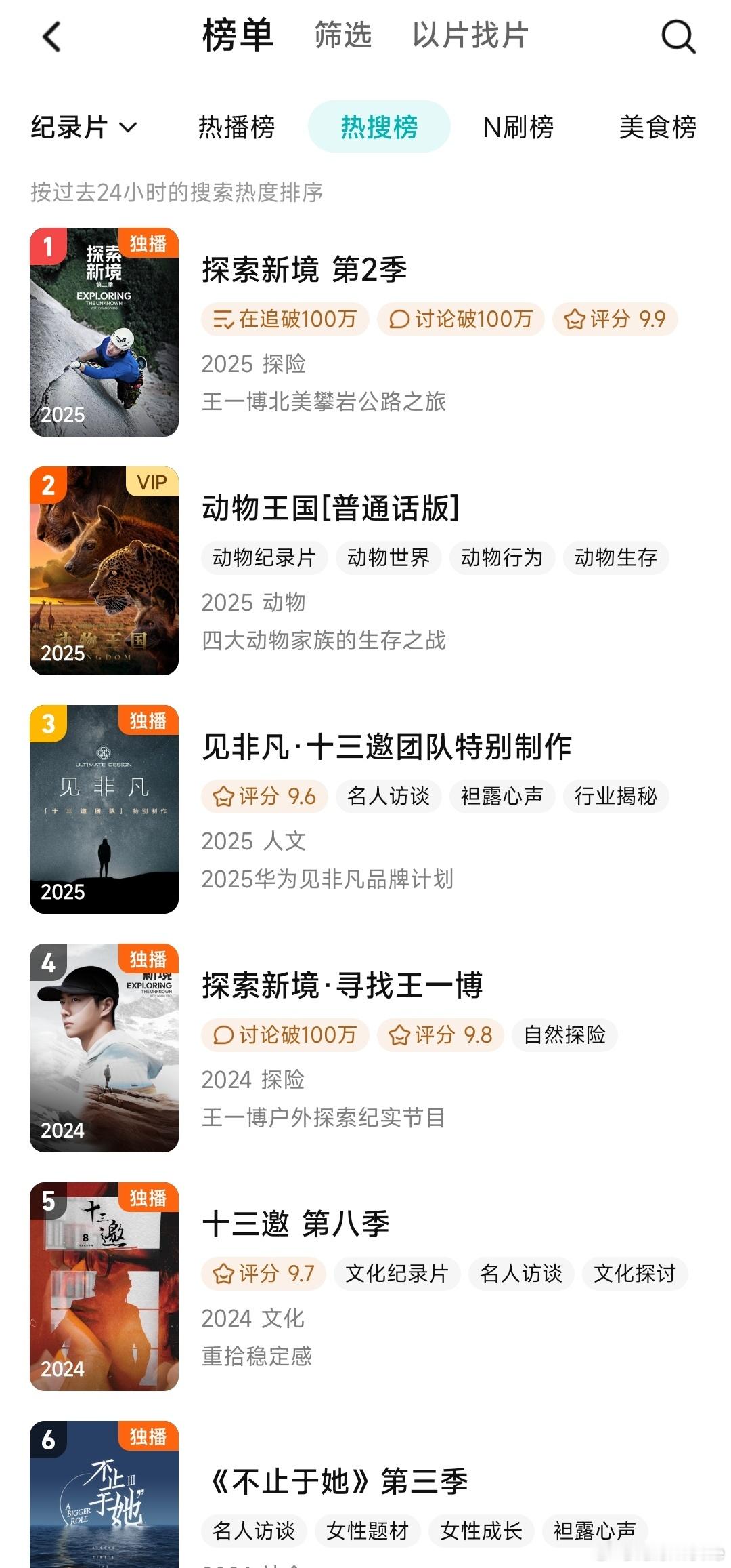 没人不爱《探索新境2》,开播一个月,8.2万人打分,依旧9.9,即便不是在播时间段,仍是纪录片热播、热搜榜第一。不设限,即本色,《探索新境2》的内核,王一博的人生哲学,与你我共振的含金量还在提升。探索新境2探索新境跨年电影愿