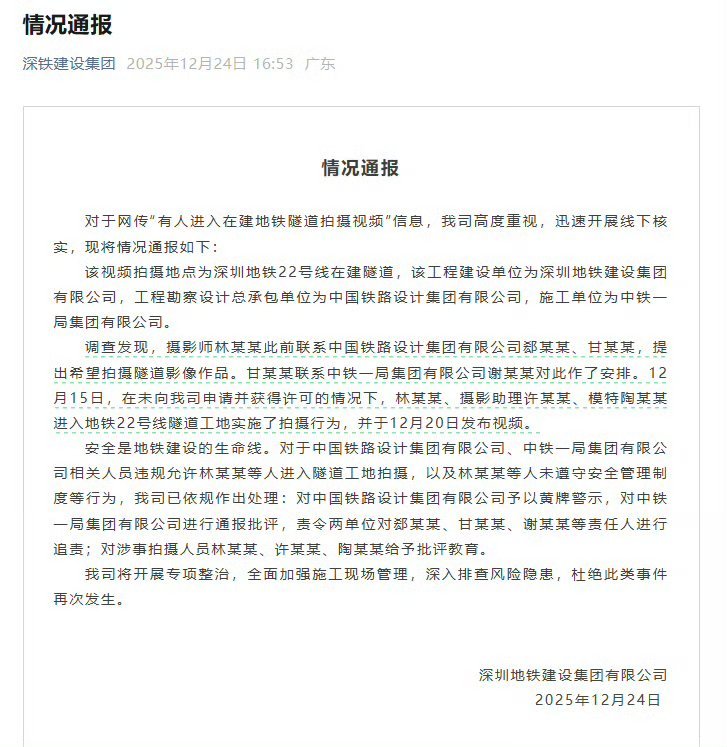 深圳地铁通报女子在隧道内拍照 又是显摆惹的祸!再建地铁隧道没有通车,而且事先经过协调和建筑单位打了招呼,也没有相应的施工行为。这种情况下,进地铁隧道拍照不大可能发生安全事故,悄悄进行不被公众发现一般没事。但如果公开发出来,就会让网民看到特权现象,自然就会引发谴责和追责。