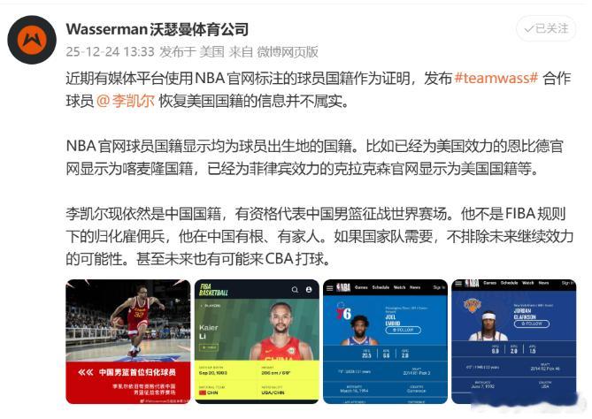 经纪公司:李凯尔现依然是中国国籍,网传其恢复美国国籍并不属实12月24日讯 根据李凯尔经纪公司Wasserman沃瑟曼体育公司报道:李凯尔现依然是中国国籍,有资格代表中国男篮征战世界赛场,网传其恢复美国国籍的信息并不属实。原文如下:NBA官网球员国籍显示均为球员出生地的国籍。比如已经为美国效力的恩比德官网显示为喀麦隆国籍,已经为菲律宾效力的克拉克森官网显示为美国国籍等。李凯尔现依然是中国国籍,有资格代表中国男篮征战世界赛场。他不是FIBA规则下的归化雇佣兵,他在中国有根、有家人。如果国家队需要,不排除未来继续效力的可能性。甚至未来也有可能来CBA打球。
