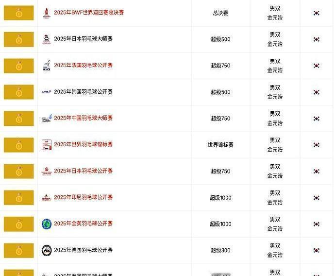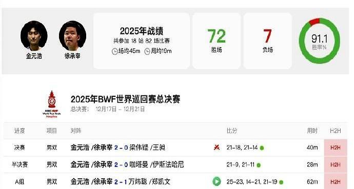 站在领奖台上时,对手看他们的眼神里没有不甘,只有一种认命的茫然。 横扫梁王,完成四杀。2025总决赛,只是他们撕开的第11道口子。 男双历史被改写,BWF官方盖章:这叫历史性统治。 徐承宰的单季12冠,冰冷地追平了桃田贤斗的神话。91.1%的胜率意味着什么? 每打十场,你只能挣扎着从他手里抠走不到一局的分数。 但世界冠军徽章擦了又擦,他的陈列柜里,仍缺一枚奥运奖牌。 所以你看懂了——2026开年,马来西亚和印尼的冠军只是顺路领取。18场连胜是过程,积分榜上领先第二名近3万分的鸿沟,才是他们写给巴黎的战书。 羽坛男双已进入单极时代。 他们现在打的不是球,是在浇筑一座名为“洛杉矶”的纪念碑。 冠军收割机尚未熄火,因为最关键的勋章,还挂在四年后的洛杉矶上空。