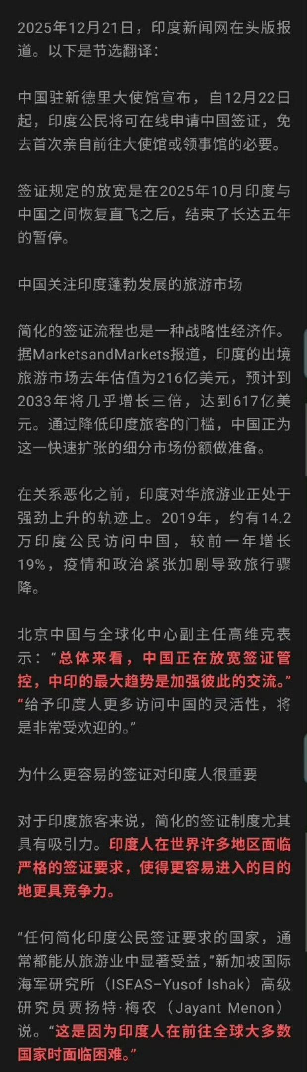 我国再次降低印度人来我国门槛,只需网上申请签证即可,不必本人亲自到大使馆。 印度媒体为这项12月22号开始实行的政策集体欢呼。 他们表示印度人正在许多国家地区面临越来越严格的签证要求而中国做了正确选择。 有亚洲研究所认为,印度人必将大量涌进中国,旅游行业会收益,因为现在印度人前往大多数国家时面临困难。 看完外媒报道感觉:好吧,希望我们也能得到点什么好处,而不是纯粹做了烂好人,帮助印度人度过苦难时期。 印度来华签证 外国人游印度