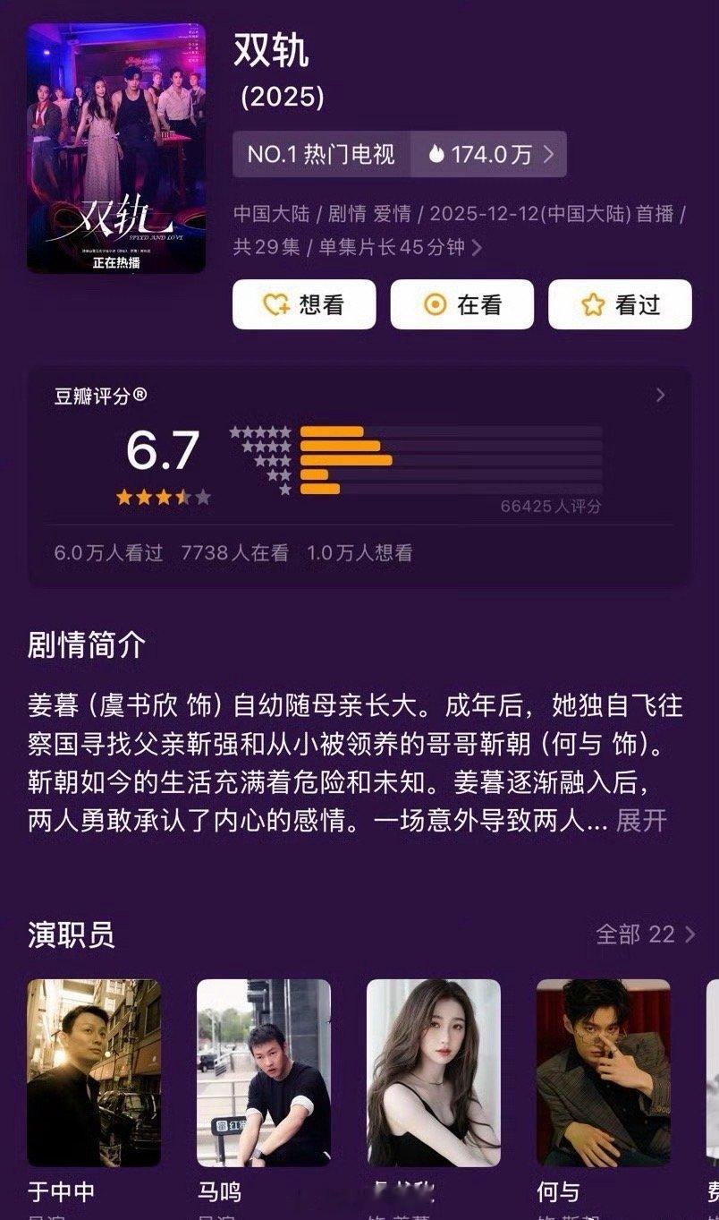 虞书欣新剧《双轨》豆瓣开分了,6.7还有上升空间吗