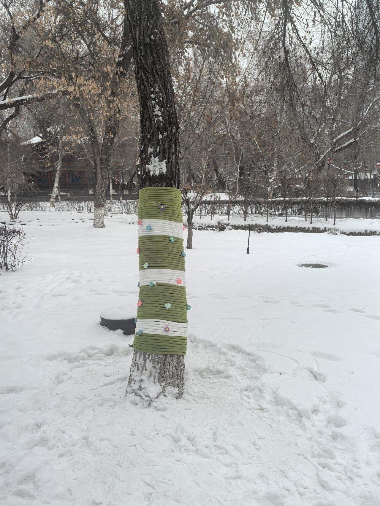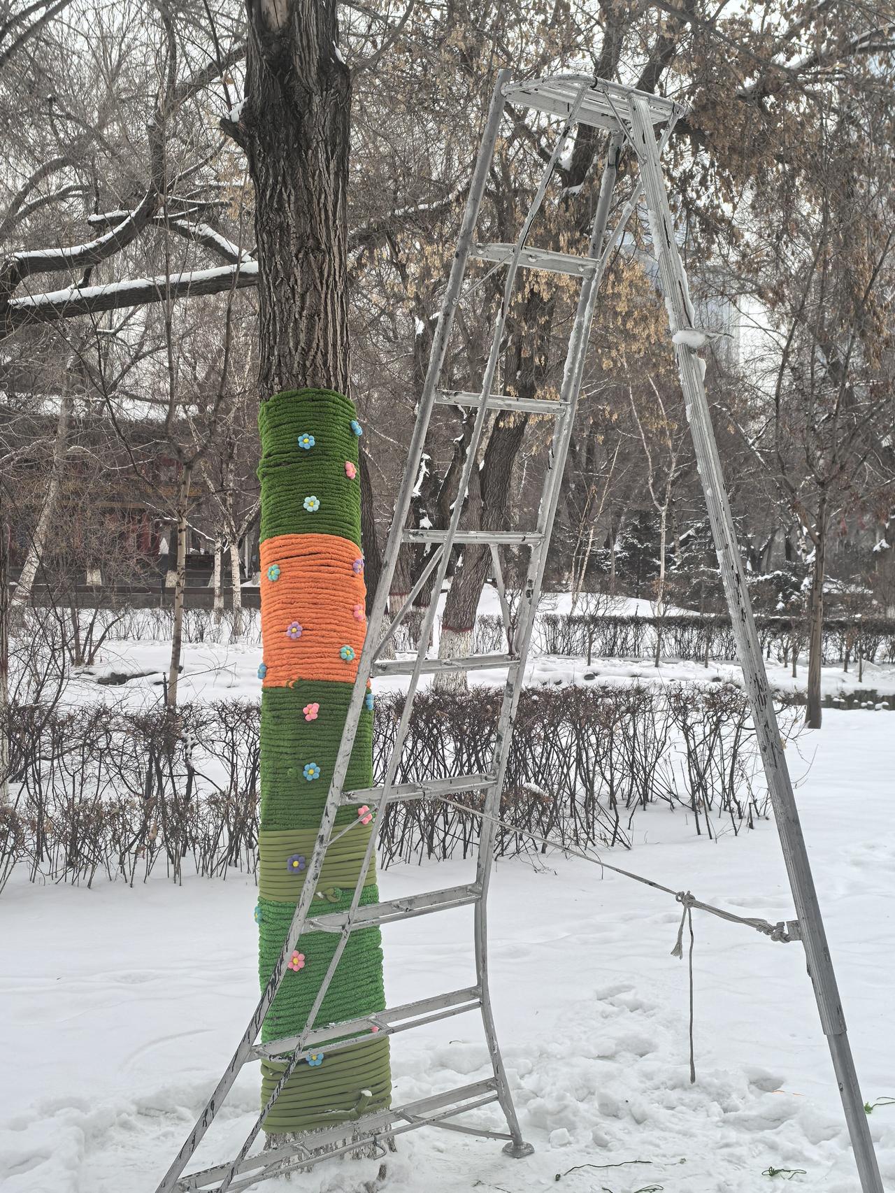 冬季里的乌鲁木齐西公园,园林工程师给榆树,穿上了五颜六色的毛衣,给银装素裹的世界