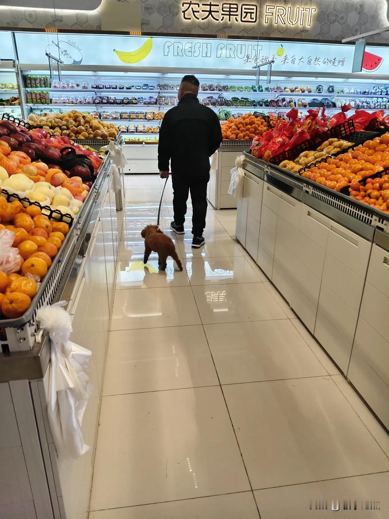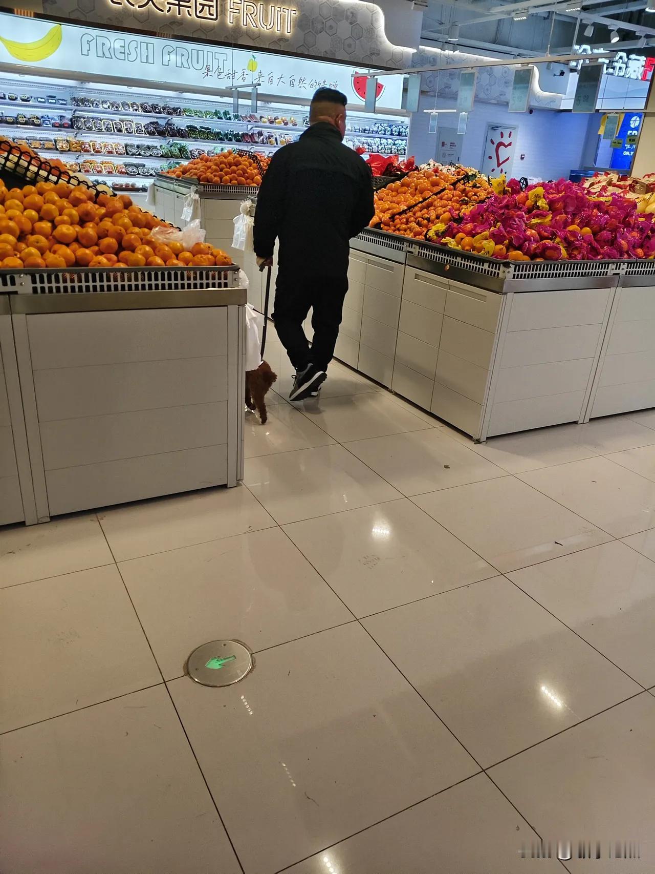 这类人该拿他怎么办? 超市里。 男子牵着狗狗堂而皇之地进入。营业员大喊:“宠物不