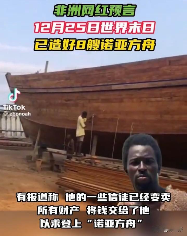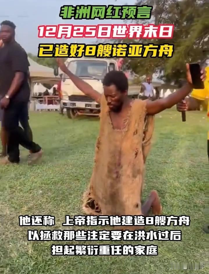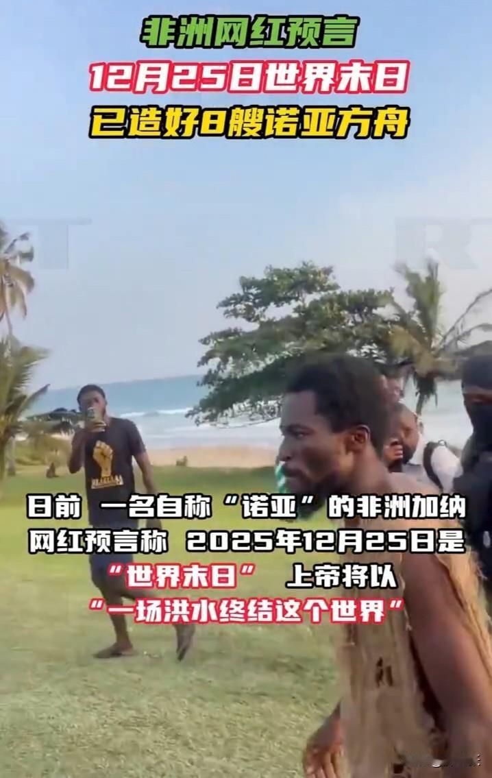 真是啥人都能冒充“预言家”了,这是不是在博流量? 一名自称“诺亚”的非洲加纳网红预言称,2025年12月25日是“世界末日”,上帝将以“一场洪水终结这个世界”。 他还称,上帝指示他建造8艘方舟,以拯救那些注定要在洪水过后担起繁衍重任的家庭。 我感觉他用这个噱头在博流量,真是啥人都能冒充“预言家”了! 这事我看来纯属“扯淡”,明天就是他预言的时间了,坐等吧!