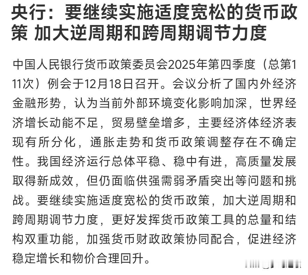 央行又释放重磅利好了,也许降息真的不远了。 今年已经不知道是第几次提起要释放宽松的货币政策,资本市场今年确实涨得也比较好,股市从年初的3000点涨到了3900点。 这次重提宽松的货币政策就是给投资者信心,而且可能是为一月降息在做铺垫,现在市场的预期就是国内一月会降息。 每次央行提出宽松的货币政策,资本市场都会有一波不错的涨幅,目前资本市场缺的就是流动,宽松的货币就是市场需要的,明年股市是非常有期待的。