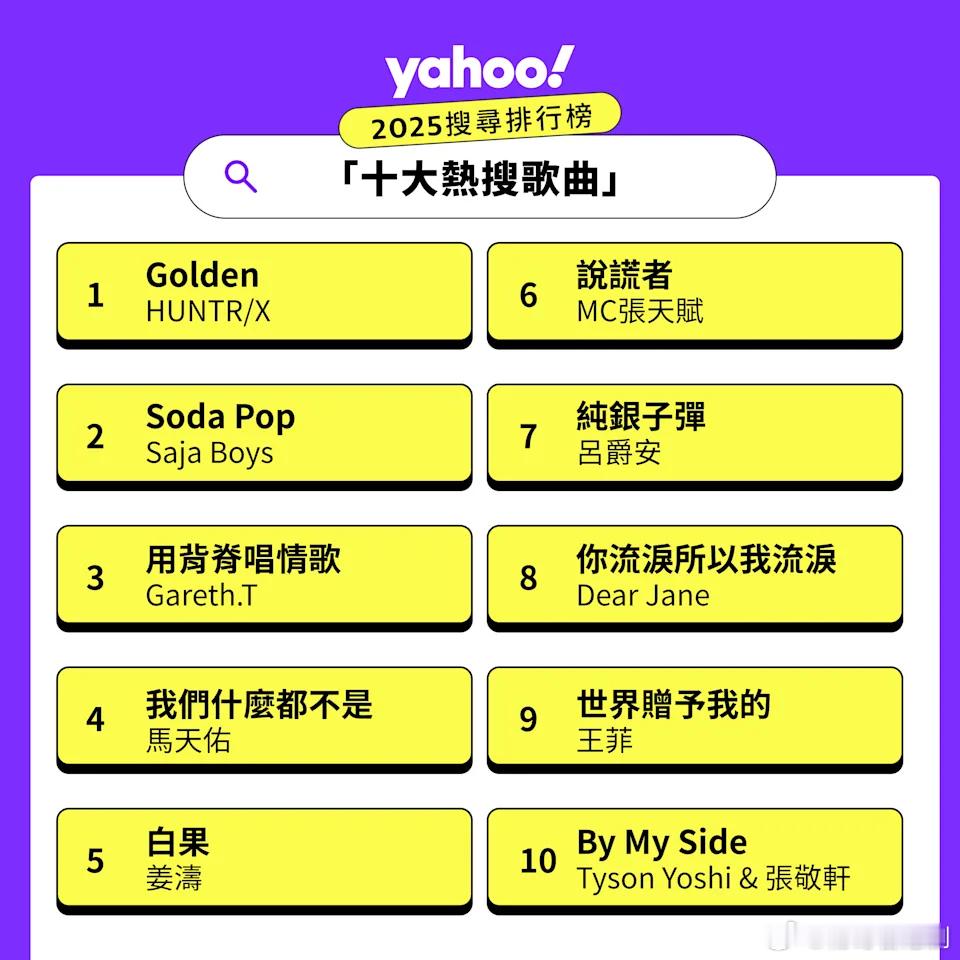 2025年Yahoo搜尋「十大熱搜娛樂人物」、「十大熱搜歌曲」排行榜.