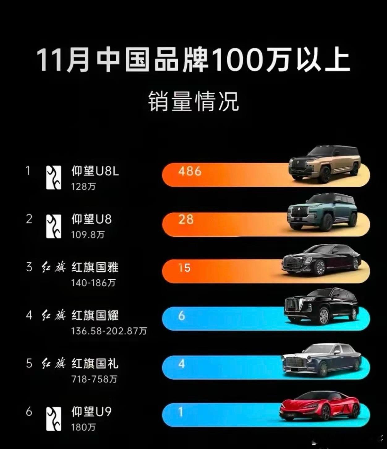 百万豪车市场,比亚迪成为最大赢家。仰望U9,11月销量:1台。国礼,11月销量:4台。国耀,11月销量:6台。国雅,11月销量:15台。仰望U8,11月销量:28台。仰望U8L,11月销量:486台。比亚迪最贵的车是仰望U9,专门用于对标保时捷、迈凯伦的超跑品牌,全款落地价超过211万,1-11月,今年累计卖出94台,虽然很贵,但大家知道同一价格,国产车配置通常是外国车的两倍以上,仰望U9超强的1306匹马力,扭矩达到惊人的1680牛米,百公里加速做到2.36秒,这个性能比400多万的外国跑车还要强大。除了仰望U9,U8和U8L也上榜了,仰望U8L确实争气,落地超140万,11月销量居然高达486台,太无敌了。红旗不愧是最豪华国产油车的代表,三款顶级豪车中,国雅销量最高,上个月卖了15台,还算不错。国雅完全对标奔驰迈巴赫,起售价几乎一样,入门版都是搭载3.0T V6发动机,但国雅的马力、功率和扭矩都更强一些,分别为394匹、290KW和570牛米,其它配置也同样领先。而外观气场这一块,二者不相上下,迈巴赫的核心优势还是品牌,说句实话,买这类型车的用户,最看重的就是排面,不看谁是最便宜的V8或V6发动机,迈巴赫上个月销量高达845台,领先国雅56倍。目前看来,百万级国产SUV销冠是比亚迪,百万级国产轿车的销冠是尊界,我认为以后最有可能打败bba的就是这两个品牌,因为比亚迪电动汽车技术遥遥领先,华为高阶智驾技术遥遥领先,品牌有了,技术了,主导超豪华市场不需要太长时间。