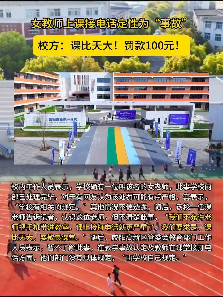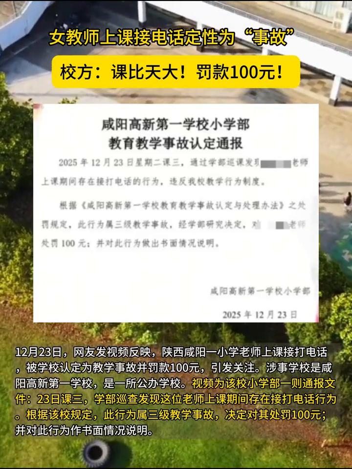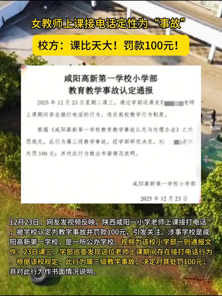 女教师上课接电话定性为"事故",校方:课比天大!罚款100元! 咸阳高新第一学校小学部教育教学事故认定通报。 2025年12月23日星期二课三,通过学部巡课发现上课期间存在接打电话的行为,违反我校教学行为制度。根据《咸阳高新第一学校教育教学事故认定与处理办法》之处罚规定。此行为属三级教学事故,经学部研究决定。老师处罚100元:并对此行为做出书面情况说明。 2025年12月23日,网友发视频反映,陕西咸阳一小学老师上课接打电话,被学校认定为教学事故并罚款100元,引发关注。涉事学校是咸阳高新第一学校,是一所公办学校。视频为该校小学部一则通报文件:23日课三,学部巡查发现这位老师上课期间存在接打电话行为。根据该校规定,此行为属三级教学事故,决定对其处罚100元;并对此行为作书面情况说明。 话方面,他们部门没有具体规定,"由学校自己规定。校内工作人员表示,学校确有一位叫该名的女老师,此事学校内部已处理完毕。对于有网友认为该处罚可能有点严格,其表示,"学校有相关的规定。"其他情况不便透露。随后,该校一任课老师告诉记者,认识这位老师,但不清楚此事,"我们不允许老师把手机带进教室,课上接打电话就更严重了。我们要求是,课比天大,要敬畏课堂。"随后,咸阳高新区管委会教育部门工作人员表示,暂不了解此事,在教学事故认定及教师在课堂接打电话方面,他们部门没有具体规定,"由学校自己规定。