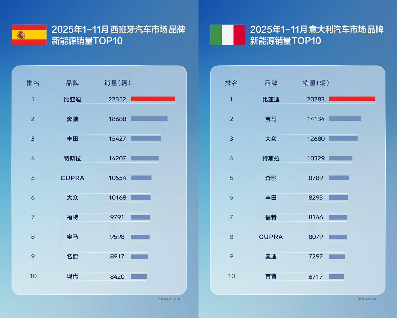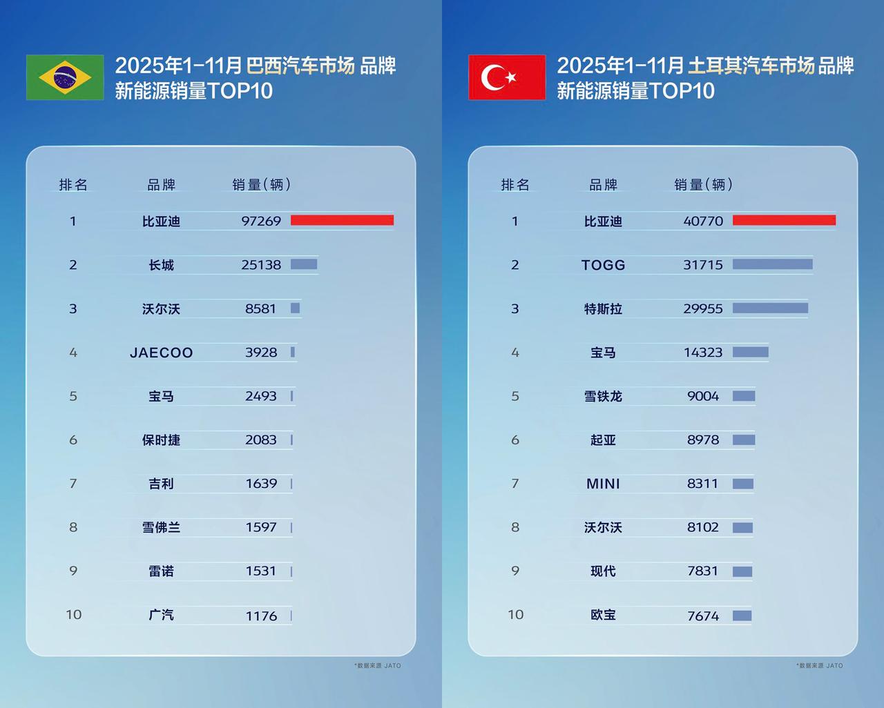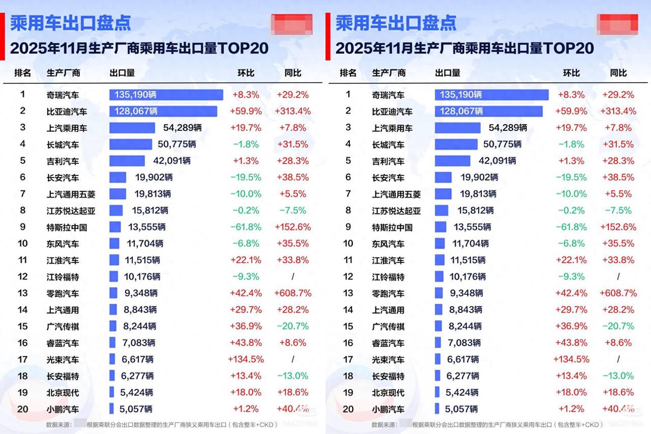 11月狂增313.4%!比亚迪出口大爆发,全球多市场登顶 给大家说个振奋的消息,权威数据显示,比亚迪今年11月的乘用车出口量太能打了,直接冲到12.8万台,跟去年同期比,增长了313.4%,翻了好几倍! 再看累计数据,今年1到11月,比亚迪乘用车出口总共87.8万台,同比增长144%,比去年一整年的出口量都翻了一倍。现在比亚迪妥妥是中国车企里出口增速最猛的之一,多国销冠全面超越。 单说11月,巴西、土耳其、意大利这些国家的新能源汽车市场,比亚迪都直接登顶;在新加坡更厉害,拿下了全品牌销量第一。而且1到11月的累计销量里,比亚迪在巴西、西班牙等国的新能源品牌中还是榜首,新加坡和中国香港地区也都是全品牌销冠,特别受当地消费者认可。 更牛的是,今年1到11月,在英、德、意、新、泰还有咱们中国等11个核心汽车市场,比亚迪销量已经全面超过特斯拉了。这离不开它丰富的车型,能满足不同国家消费者的需求,再加上自建滚装船、本地生产、完善服务这些操作,都给出海铺好了路。 现在比亚迪新能源汽车已经卖到119个国家和地区了。就在12月18日,还举行了第1500万辆新能源汽车下线仪式,成了全球首家达成这个成就的车企,也标志着中国汽车工业正式走到全球引领的新阶段,咱们中国汽车品牌再也不是跟跑者,而是在主导新秩序了!
