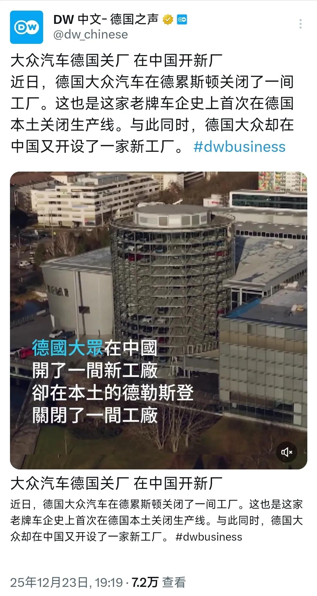 德国之声昨晚(12月23日)报道:“大众汽车在德国关厂,在中国开新厂。近日,德国大众汽车在德累斯顿关闭一家工厂。这也是老牌车企史上首次在德国本土关闭生产线。与此同时,德国大众却在中国又开设了一家新工厂。” 俄乌冲突爆发,德国紧跟“政治正确”,制裁俄罗斯却遭反噬,致能源危机,物价高企,德国制造业深受其害。大众汽车产品价格在国际市场上早已失去竞争力,在关闭该厂前已开始裁员计划,到2030年前拟裁员3.5万人。德国前政府出台相互矛盾的对华“三重定位”,至今仍在坚持对华“去风险”,但德国资本反其道而行之,对华投资额屡创新新高。希望德国政府同中方相向而行,“去风险〞只会给德国带来风险。