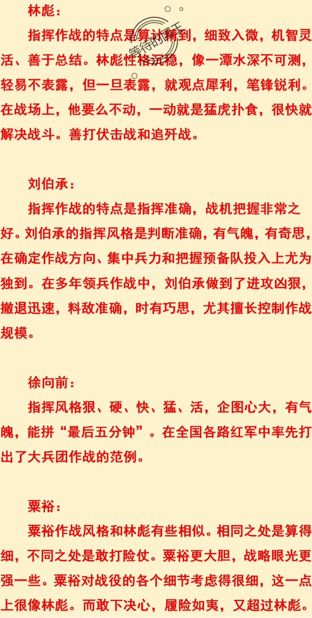 顺境看林 逆境看粟 困境看刘 难境看徐 绝境看彭 如图所示,我军最会打仗的五大开国将帅作战特点简介。从他们各自发挥的作用看,在建军初期特别“难”的情况下,红四方面军歼敌88万。在抗战特别“困”苦的情况下,129师歼敌42万。在解放战争时期,四野携百万大军,“顺”利赢下两大战役,总歼敌188万。三野则是“逆”风翻盘,以少胜多,总歼敌245万。在1950年朝鲜面临“绝境”的关键时刻,彭老总勇挑重担,打败了17国联军,共毙伤俘71万余人。五位将帅在四个不同时期,他们都发挥了不可替代的作用。他们之所以备受军迷推崇,就是因为他们都有自己辉煌的战绩。要说谁最厉害?1955年的授衔排名已经给出了答案。
