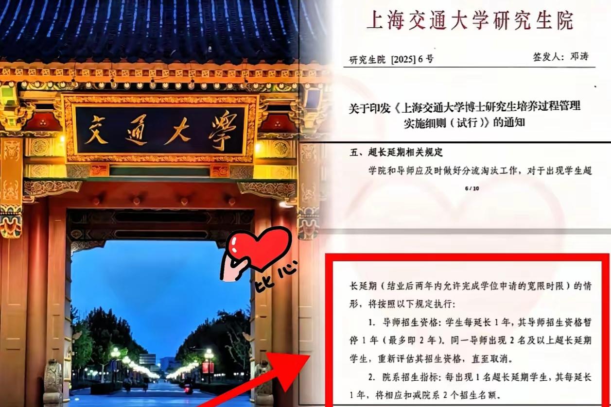 上海交大这一刀,砍得够狠也够准!直接把学生延毕和导师“饭碗”绑死,这下,那些把博士生当私人财产、廉价劳动力的“老板”们,彻底慌了。 曾见一位博士朋友,三十好几的人,几杯酒下肚哭得像个孩子。导师只顾揽活搞钱,对他的毕业不管不顾,大好年华全被耗空。利益的绳子一勒紧,看谁还敢只用人不教人? 别总怪学生不行,很多时候是引路人带偏了方向。教书育人一旦变成一门生意,才是学术界最大的悲哀!