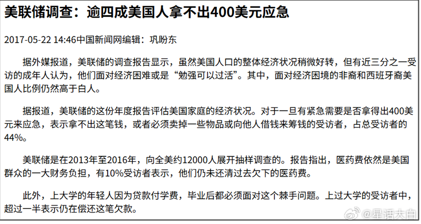 之所以有斩杀线,其中一个重要原因,就是美国人的工作收入虽然高,但各类刚性支出成本太高,以至于手头能拿来应急的资金很少。2020年,有个美国议员怼美国疾控时提到:“40%的美国人拿不出400美元的紧急支出,而仅2019年一年,就有33%的美国人放弃了治疗。”她这个:“40%的美国人拿不出400美元的紧急支出”数据是来自于美联储的调查。美联储每年都会出年度报告评估美国家庭的经济状况。比如2016年,对于一旦有紧急需要是否拿得出400美元来应急,表示拿不出这笔钱,或者必须卖掉一些物品或向他人借钱来筹钱的受访者,占总受访者的44%。所以,在年初的中美网友大对账里,不少中国网友都诧异于,美国人拿不出多少应急资金。因为房贷、车贷、学贷、医疗保险支出、能源账单、话费账单,这些都属于刚性支出,付完这些刚性支出后,美国人收入虽高,但剩下的钱也没多少。所以,美国人碰上需要紧急用钱的时候,往往只能削减食品支出,才会看到很多美国人吃不起蔬菜的案例。收入虽然很高,但碰上捉襟见肘的时候,可能有一顿没一顿,吃不饱饭。