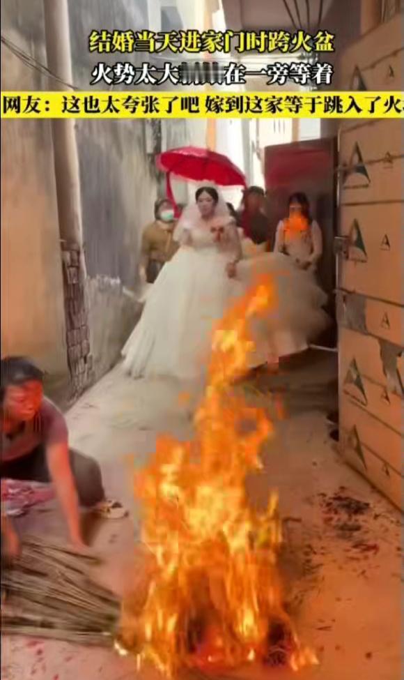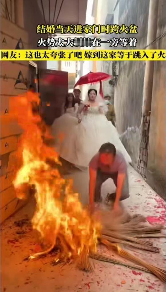 见过结婚新娘跨火盆点这么大火的吗 网友辣评:这不是结婚跨火盆,是给新娘走完人生最后一步,直接火化 这火点的,是不想让新娘进门吗?很多地方是有新娘跨火盆的习俗,人家都是一个小盆,装点炭火,能看出来有火就行,寓意以后的日子红红火火 拿这么一堆的柴火,点这么大火的,前所未见,这是新娘一来先给个下马威吗,以后好拿捏她。这么大的火啊,谁敢跨,新娘就那么在那站着等着,这事做的,任谁脸上也得挂不住吧