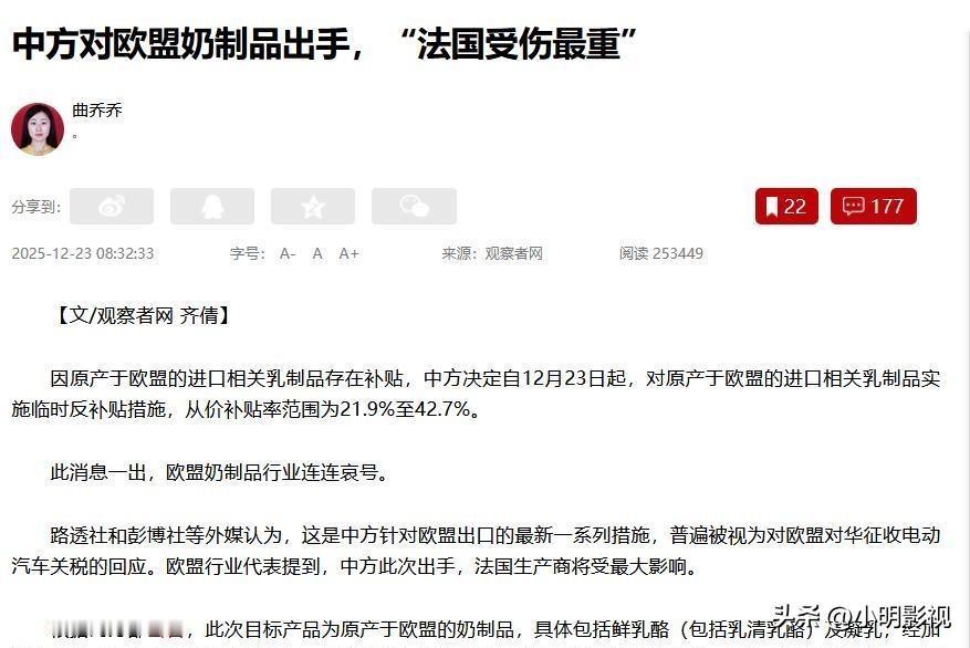 先下手为强,中国这步棋让欧盟懵了? 12月23日,商务部出手。对原产欧盟乳制品加征临时反补贴,税率21.9%到42.7%。直指法国,痛点就在奶。前脚马克龙访华握手,后脚在金融时报放话,若不贸易平衡将支持保护。中国不吃这一套,先给答案。欧盟针对中国电动车的反补贴还在,谈合作却摆关税,逻辑怪。要市场,你拿出有竞争力的货,不是让中国掏钱、投欧盟、转技术。欧盟为争南美市场放松农产品准入,本土农民都上街;到中国这边却只会说必须如何。逆差难受可以理解,办法不是复制美国那一套。中国需要进口,也愿买好东西,问题是欧盟卖不卖。结论清晰,合作欢迎,威胁免谈,要博弈奉陪。