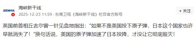 英国前首相丘吉尔曾一针见血地指出:“如果不是美国投下原子弹,日本这个国家也许早就消失了!”换句话说,美国的原子弹加速了日本投降,才没让它彻底毁灭! 搁1945年夏天,这话绝非夸大其词,彼时的日本早已是强弩之末,却偏要硬撑着上演“一亿玉碎”的闹剧,若不是两颗原子弹精准击碎其幻想,这弹丸岛国大概率会在登陆战的炮火里彻底沦为焦土,连传承千年的根基都保不住。 1945年初,日本军费开支占到国民总产值的百分之九十九,全靠发行战争公债和掠夺占领地资源续命,可随着制空权丧失、海军覆灭,其海外资源运输通道被彻底封堵,返回本土的运输船百分之八十都被击沉。 本土钢材储备仅剩二十六万吨,战争工业急剧萎缩,石油储备更是只有四十万吨,到七月连海空军战机一次出击的燃油都凑不齐,只能逼着民众上山挖松树根炼油,荒唐又可悲。 民生层面更是惨不忍睹,物价飙升到1937年的三百五十倍,民众每天食物配给量连二百五十克都不到,政府甚至下令小学生收集五百万担橡子充饥,饿殍遍野的景象已在眼前。 即便如此,日本高层仍揣着明白装糊涂,死咬着“有条件投降”的幻想不放,铁了心要搞本土决战。 1945年2月,日本大本营宣布“从根基开始动员”,征召19到40岁男性、40到45岁老兵乃至17到19岁少年,硬生生凑出150万作战部队,可武器装备缺口大到惊人,新编部队仅配备一半定额的步枪、不到三成的轻机枪,不少士兵只能拿着竹枪训练。 更疯狂的是当年6月,铃木贯太郎内阁通过《义勇兵役法》,将15到60岁男性、17到45岁女性悉数编入“国民义勇战斗队”,硬生生凑出2800万兵力,这些没经过正规训练的平民,拿着自制武器就要去跟武装到牙齿的美军拼命,所谓的本土决战,说白了就是拿全体国民的性命当赌注。 日本的顽抗,早已被美军看透,当时美国已经制定好了登陆日本本土的“没落行动”计划,准备1945年11月先登陆九州,1946年5月再进攻本州,直取东京。 可从冲绳战役的惨状来看,美军太清楚登陆日本本土要付出多大代价——马歇尔上将当时就向杜鲁门总统预判,九州之战美军总伤亡可能达7万人,日军则会超过35万人; 而规模更大的本州战役,美军预计阵亡20万人、轻重伤60到80万人,日军官兵和平民死亡人数更是会达到500到1000万。 再加上当时日本本土已濒临饥荒,大规模瘟疫必然随之爆发,按照这个趋势,日本总人口的五分之一都会在一年内丧命,所谓的“皇国”只会沦为一片焦土,连人种传承都要面临危机。 真正打破这个死局的,正是美国投下的两颗原子弹。1945年8月6日,“小男孩”原子弹落在广岛,瞬间摧毁了这座城市三分之一的面积,数十万人生死不明;8月9日,“胖子”原子弹降临长崎,再次给日本带来毁灭性打击。 这两颗原子弹的威力,不仅在于瞬间的破坏,更在于彻底击碎了日本高层的侥幸心理。 在此之前,日本军方还在隐瞒广岛的灾情,试图煽动民众继续抵抗,可长崎的爆炸声让他们彻底清醒——美军拥有他们无法抵御的终极武器,再顽抗下去,不是“玉碎”而是彻底的灭国,连天皇制度都保不住。 日本当时的抵抗核心,就是寄希望于通过本土决战让美军付出惨重代价,从而迫使对方接受有条件投降。可原子弹的出现,让这个幻想彻底破灭,他们意识到无论如何抵抗,都无法抵挡这种毁灭性武器,继续打下去只会让整个国家从地图上消失。 更关键的是,8月8日苏联出兵中国东北,击溃了日本赖以支撑的关东军,这让日本彻底陷入腹背受敌的绝境,再无任何谈判筹码。 此前还在争论是否投降的日本高层,在两颗原子弹和苏联出兵的双重压力下,终于放弃了顽抗,天皇裕仁于8月15日宣布无条件投降,这场持续多年的战争就此落幕。 很多人觉得原子弹给日本带来了沉重灾难,却忽略了若没有这两颗原子弹,日本要面对的是更彻底的毁灭。 当时的日本,资源耗尽、民不聊生,却硬要裹挟全体国民走向死亡,美军的登陆战只会是一场血肉横飞的消耗战,日本的城市会被逐一摧毁,民众会在饥荒、瘟疫和炮火中大量死亡,即便最终战败,也只会沦为一片废墟,失去作为一个国家的所有根基。 而原子弹的出现,以最快的方式终结了战争,虽然造成了巨大伤亡,却避免了更大规模的毁灭,让日本保住了国家实体和民族传承。 丘吉尔的判断,恰恰点透了当时的真相——不是原子弹拯救了日本,而是原子弹及时终止了日本的疯狂,让这个早已濒临崩溃的国家,不至于在自我毁灭的道路上走到尽头。 信息来源:东南卫视《海峡新干线》栏目官方账号2025年12月23日发文