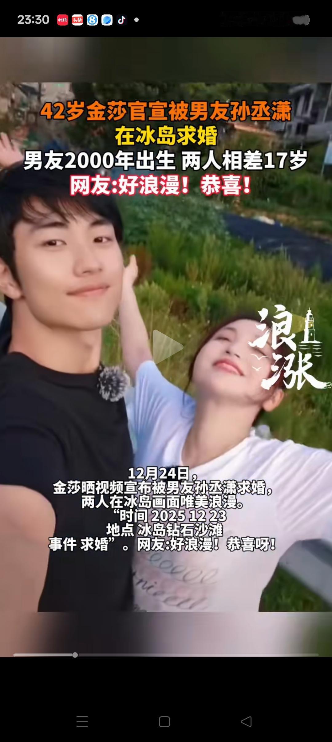 42岁的金莎被小17岁的男友孙丞潇求婚, 再次验证了一个真理! 那就是女人不管多大年纪,都一定要坚持自我,有自己独立的事业,人生,不必围着别人团团转! 只有这样的你,才最有魅力! 即使小17岁的男生,也一样会欣赏你,愿意和你在一起,还是那种真心实意的。 年龄从来都不是问题,只要两个人真心相爱,一样可以相处的很愉快,生活幸福。。 加油吧,你不必在意别人的眼光,自己开心就好。 姐弟恋也不错啊[爱慕][爱慕]