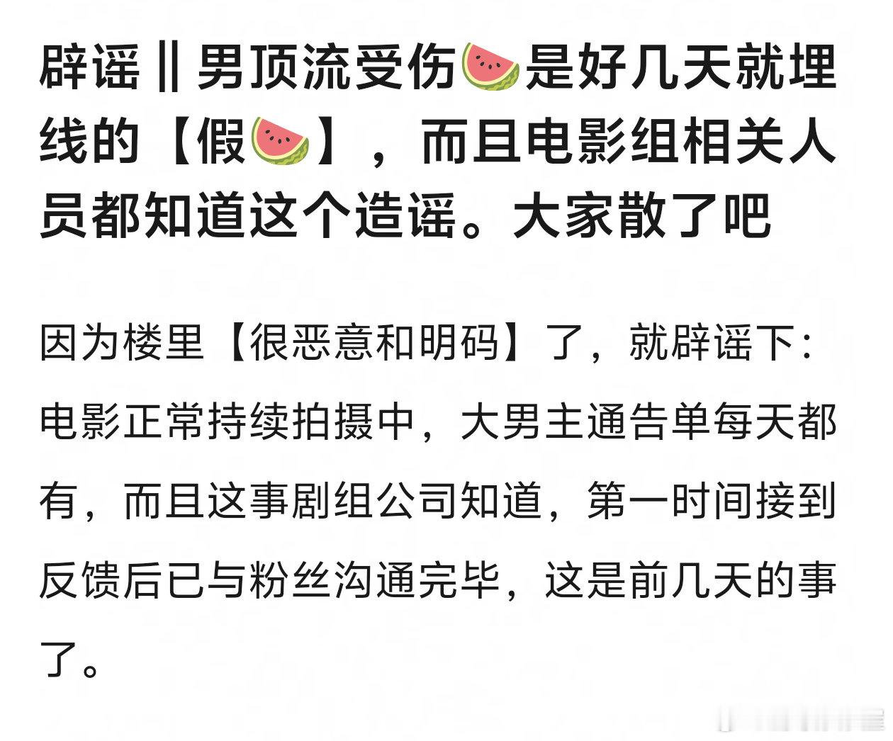 有人爆料电影届刚起来的男顶流拍戏受伤了,破相很明显网友很多人都在猜同一个人,随后粉丝直接辟谣说这是前几天传出来的事今天发酵了,期间他每天都有拍摄戏份,所以不可能是了吧……咋能随意造谣人家受伤呢莫名其妙的