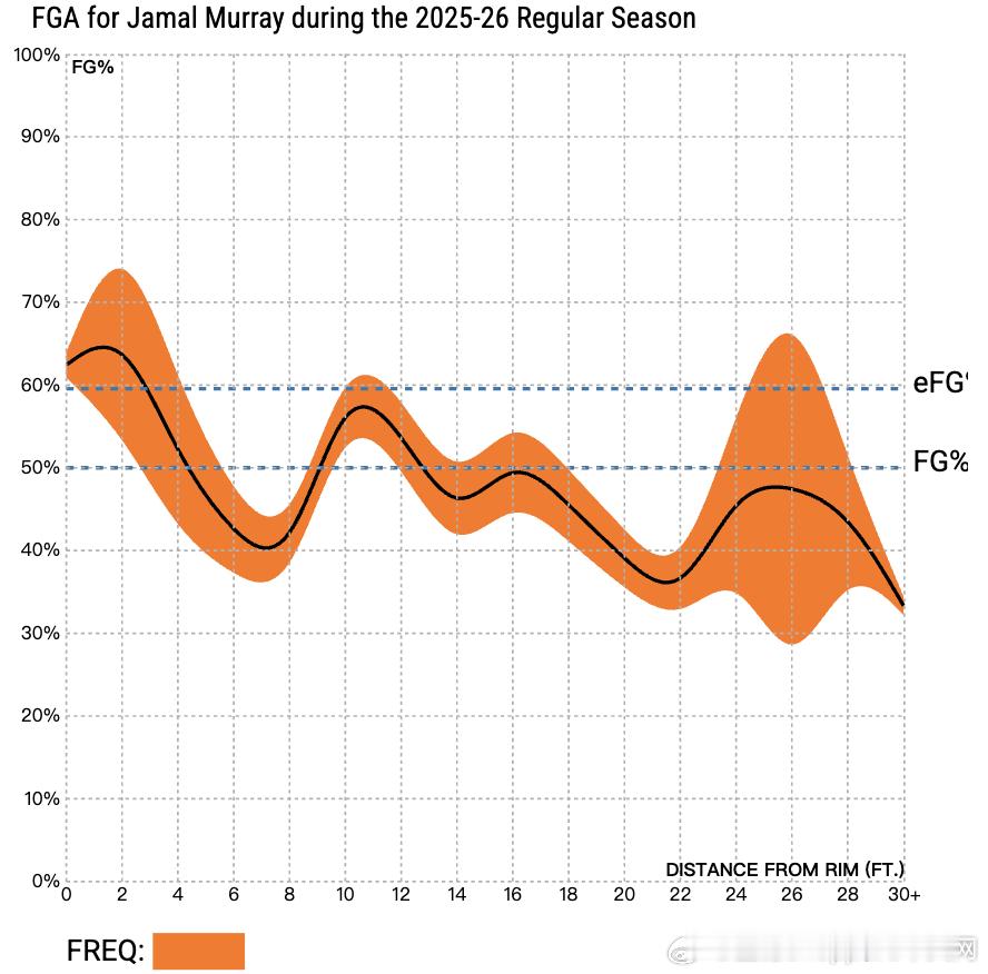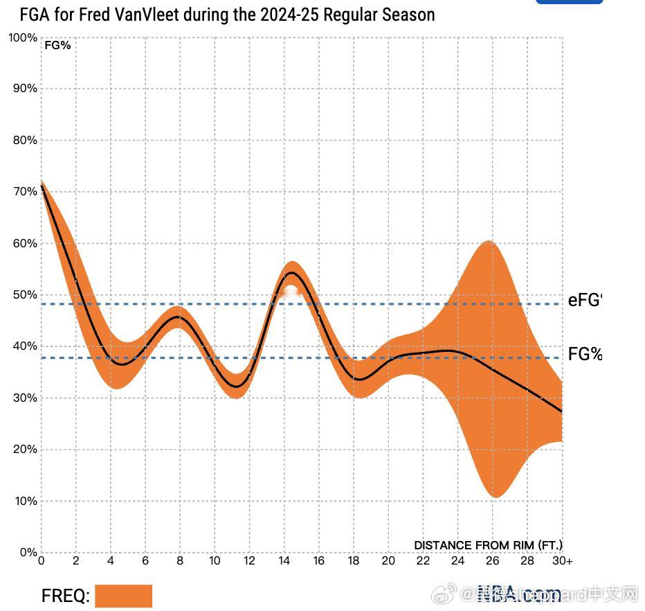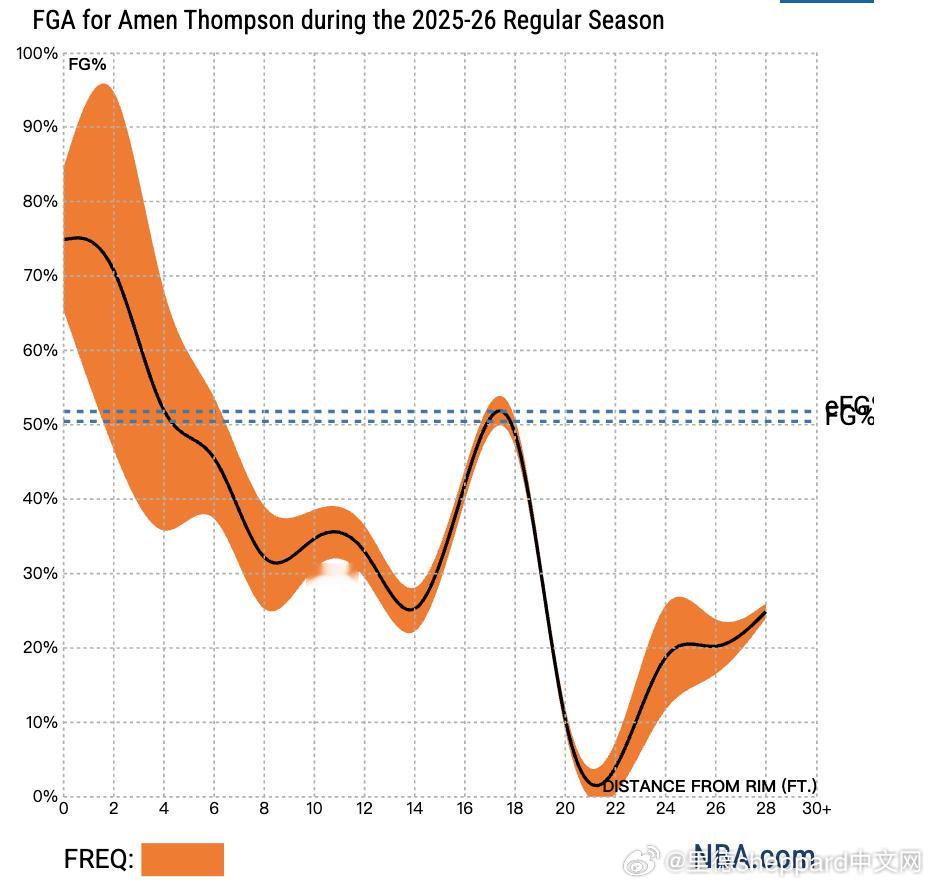来看下阿门和谢泼德的出手距离和频率横轴是出手距离(英尺),纵轴是命中率,橙色加深部分代表出手频率(面积越大,出手越多)图1 是谢泼德的,你能看到谢泼德是大量的外线投篮,突破到篮下的出手相对少,中距离有但是量没有外线多图2是阿门的,你会看到阿门好像是谢泼德的“镜像”,绝大部份出手都是距离篮筐12英尺内的出手,集中在篮下区域,外线有一些出手但命中率很差就是我们本赛季,在1号位或者替补,就算包含霍勒迪在内,缺乏一个既能突破攻击篮下,又能在外线投篮的这么一个球员。。。而kd和申京周围需要的就是这么一个球员。。。再看图3,作为对照组,我们来看下掘金穆雷,这个篮下和外线的出手频率和命中率就非常合理而且理想!要想解决火箭1号位的问题,要么就是阿门练出来外线投射,要么就是谢泼德多突破内线。再看下图4,是上赛季fvv的图,你会看到fvv是我上面说的突破篮下出手和外线出手,这两个位置比重很大的球员。所以知道火箭目前1号位的情况以后,那么就是要么你能忍受,慢慢等待球员成长⌛️;要么就是,你期待fvv早点复出🩼;要么就是,你期待斯通在中期交易有点动作💰休斯顿火箭休斯顿火箭nba NBA[超话]