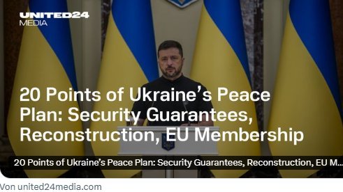 泽连斯基首次公布乌克兰和平计划的全部20项内容1. 确认乌克兰主权。2. 俄罗斯与乌克兰签署互不侵犯条约。3. 乌克兰将获得强有力的安全保障。4. 乌克兰和平时期武装部队人数限制在80万人以内。5. 美国、北约和欧洲向乌克兰提供类似于《北约宪章》第五条的安全保障。如果俄罗斯再次入侵,将采取军事回应并重新实施制裁。6. 俄罗斯将对欧洲和乌克兰的互不侵犯政策写入所有相关法律。7. 乌克兰在预定的时间内加入欧盟,并确定入盟日期。8. 制定一项全球发展方案,具体内容将在单独的投资协议中予以明确。9. 设立总额达8000亿美元的多个乌克兰重建基金。10. 乌克兰与美国签署自由贸易协定。11. 乌克兰承诺不寻求发展核武器。12. 扎波罗热核电站问题。没有妥协的余地。美国提议由美方主导的三方管理模式。基辅方面则提出美乌平等共同管理的方案。13. 在学校推行旨在培养宽容、促进跨文化理解、消除种族主义和偏见的教育项目。14. 领土问题。乌克兰的提议:‼️俄罗斯从第聂伯罗彼得罗夫斯克州、尼古拉耶夫州、苏梅州和哈尔科夫州撤军。‼️在顿涅茨克州、卢甘斯克州、扎波罗热州和赫尔松州,则坚持“我们留在原地”的原则。俄罗斯要求乌克兰从顿涅茨克州撤军。美国提议以建立自由经济区作为妥协方案。‼️如果双方无法就“维持现状”原则达成一致,自由经济区方案只能通过在乌克兰举行全民公投来实现,届时必须对整个协议进行投票表决。15.俄罗斯和乌克兰承诺不使用武力改变协议。16.俄罗斯不会阻碍乌克兰利用第聂伯河和黑海进行商业活动。金布恩沙嘴将被非军事化。17.所有囚犯全部交换,平民、儿童和政治犯全部返回乌克兰。18.乌克兰承诺在协议签署后尽快举行选举。19.该协议具有法律约束力,并由美国总统主持的“和平理事会”进行监督。20. 各方同意所列条件后,全面停火制度立即生效。