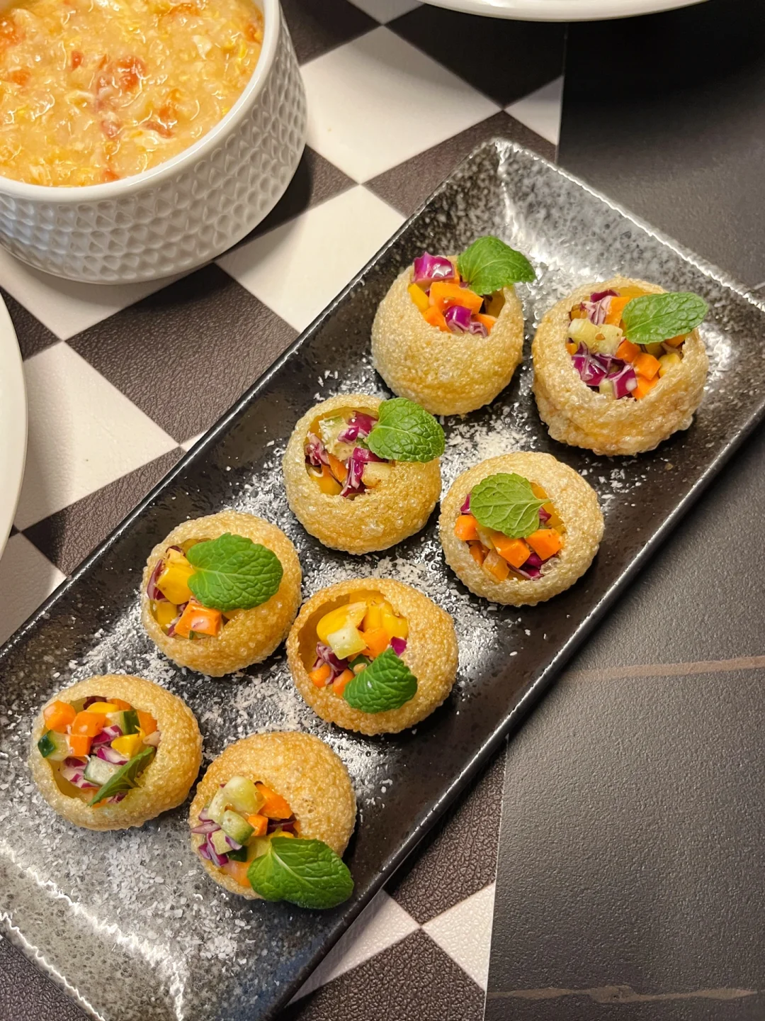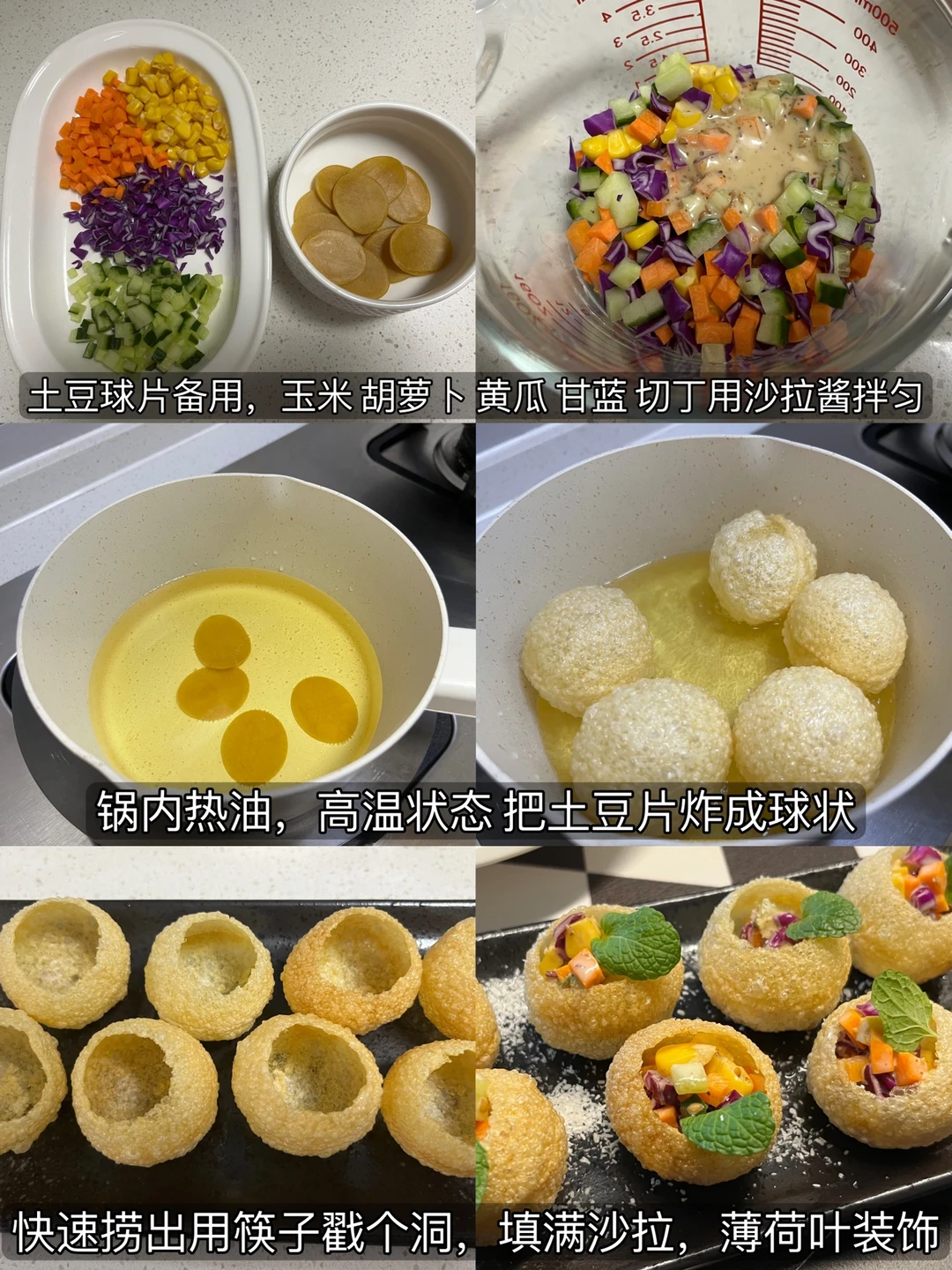 🥢空心士豆球沙拉:高颜值美食,土豆球在网上买的,这个做法也很简单,蔬菜粒或者水果粒加沙拉酱拌好再装进炸好的土豆球就可以~