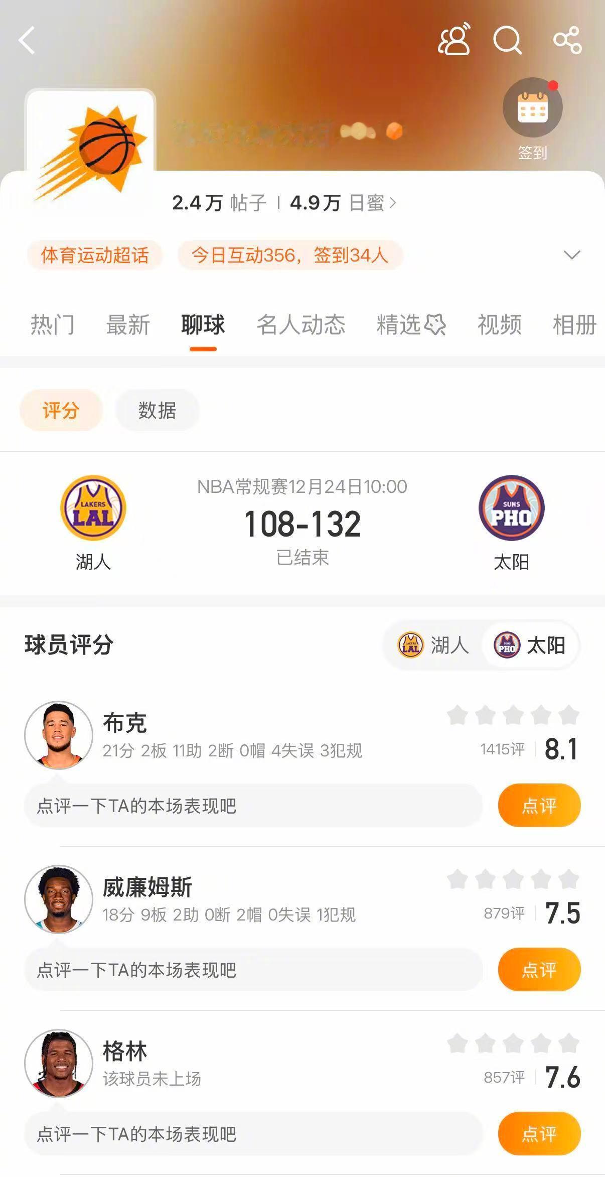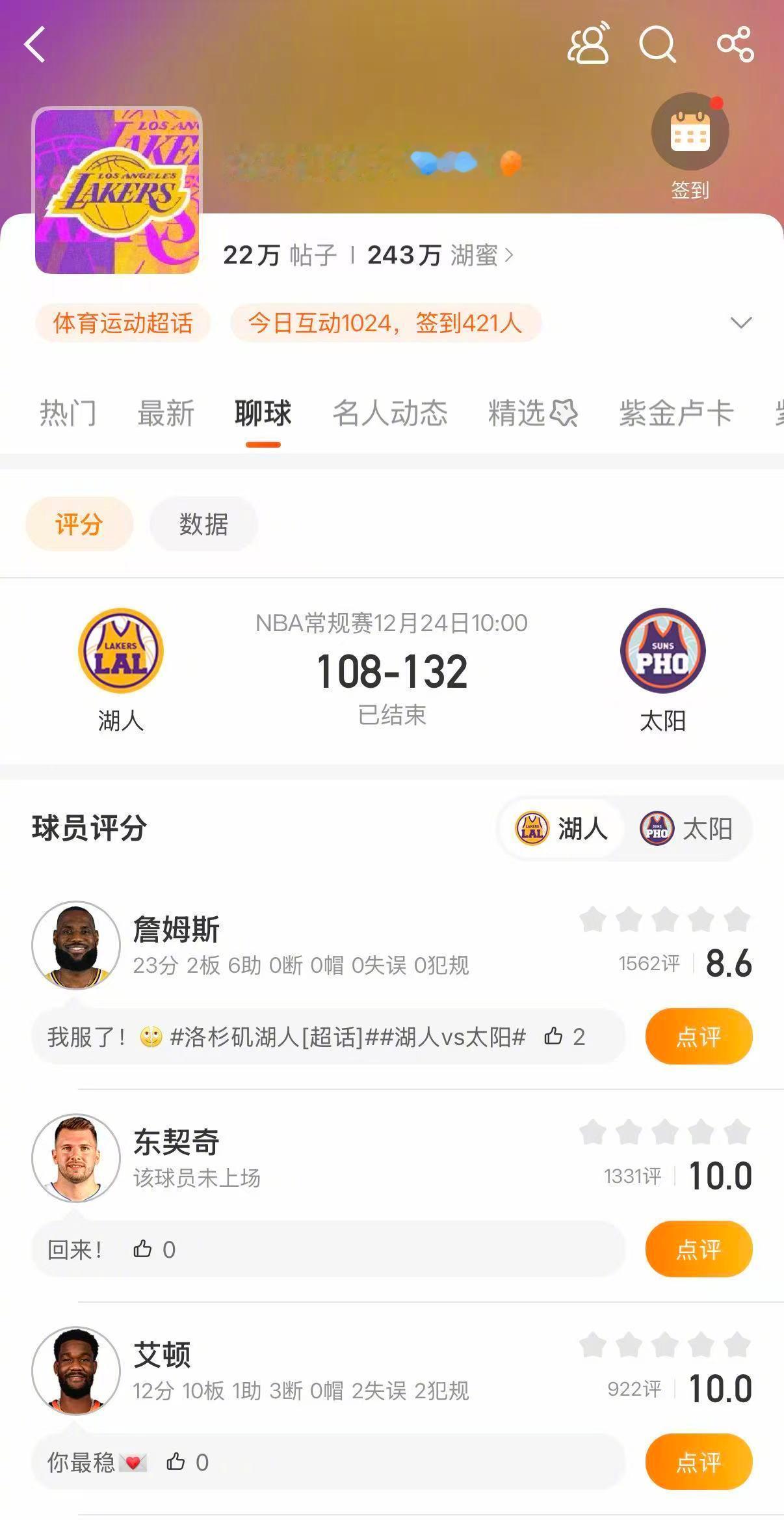 湖人不敌太阳 太阳132-108大胜湖人。狄龙25分,布克21分2篮板11助攻,威廉姆斯18分9篮板。湖人方面,东契奇因伤缺战,詹姆斯23分2篮板6助攻,里夫斯复出17分2篮板2助攻,斯玛特14分。欢迎大家进入球队超话菲尼克斯太阳 和洛杉矶湖人 对球员表现进行评分!