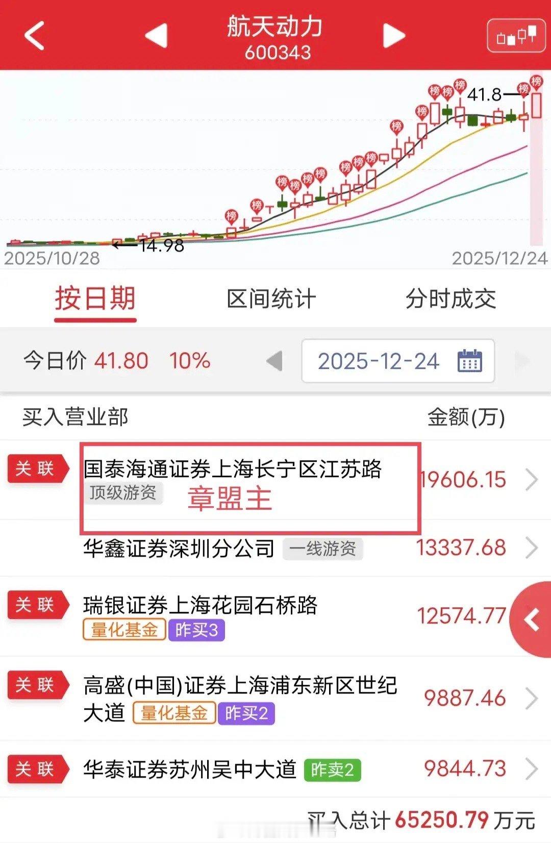 章盟主爆买近2亿:今天航天动力尾盘涨停。盘后龙虎榜显示,章盟主爆买近2亿。昨天刚卖了几亿航天机电,今天又杀回来了。