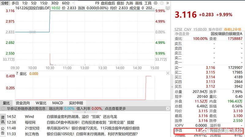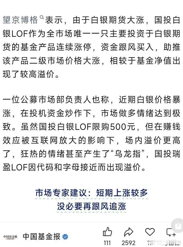 疯狂~搞白银套利的从25万户增加到30万户了国投白银昨天份额增加0.81亿份,按净值1.8527元计算,净资产增加了1.5亿元。按最新的每户申购限额500元估算,约有30万户参与套利,相比之前25万户又增加了5万户。博格昨天文章《25万户套利1250万,谁来买单?》,还提到猜测12月25日,溢价如此之多的国投白银会跌停的。结果今天24日又涨了,关键一开盘成交额就突破2亿元,相当于追高的投资者,瞬间就把套利者抛售的2个亿筹码吃掉了。这个高溢价能否维持,就看追高者与套利者之间博弈了,目前看追高者太猛了,溢价70%都敢追。按这个趋势25日下跌的概率也在降低。毕竟这几天白银走势火热,追高者封涨停的规模比昨天还要多。接下来就看:(1)基金公司是否提高申购限额;(2)参与套利的户数会不会持续增加。唯有参与套利资金越多,给有追高者的抛压才越大。另外,这个国投白银资产规模为50亿元,以白银期货投资为主。目前一手白银期货价值约25万元,国投白银持仓量差不多就是2万手了。问题是现在白银期货市场总持仓量也就34万手,若这个国投白银规模继续增长的话,说不定其对白银期货市场也会造成一定影响。这次博格也就不参与了,当个看客观察一下吧。今天有媒体采访博格这事,博格是这样说的:“谈及国投白银LOF二级市场的高溢价,望京博格表示,由于白银期货大涨,国投白银LOF作为全市场唯一一只主要投资于白银期货的基金产品连续涨停,资金跟风买入连续上涨产品,助推该只产品二级市场价格大涨,相对基金净值出现了较高溢价。他认为,随着该只产品限购额从100元提升至500元,可能会打压溢价。比如在周一申购的国投白银LOF,本周三就可以卖出了,卖盘增多会对高溢价形成压力,随着套利资金越来越多,卖盘超过买盘,二级市场价格还可能会跌停,入场较晚的投资者可能套利空间也越来越小。对于普通投资者,他建议当前白银价格短期上涨较多,没必要再跟风追涨了。他也希望金融机构可以丰富产品种类,增加投资渠道,让投资者可以以更低成本投资白银、钯金、铂金等细分资产的公募产品"基金港股a股
