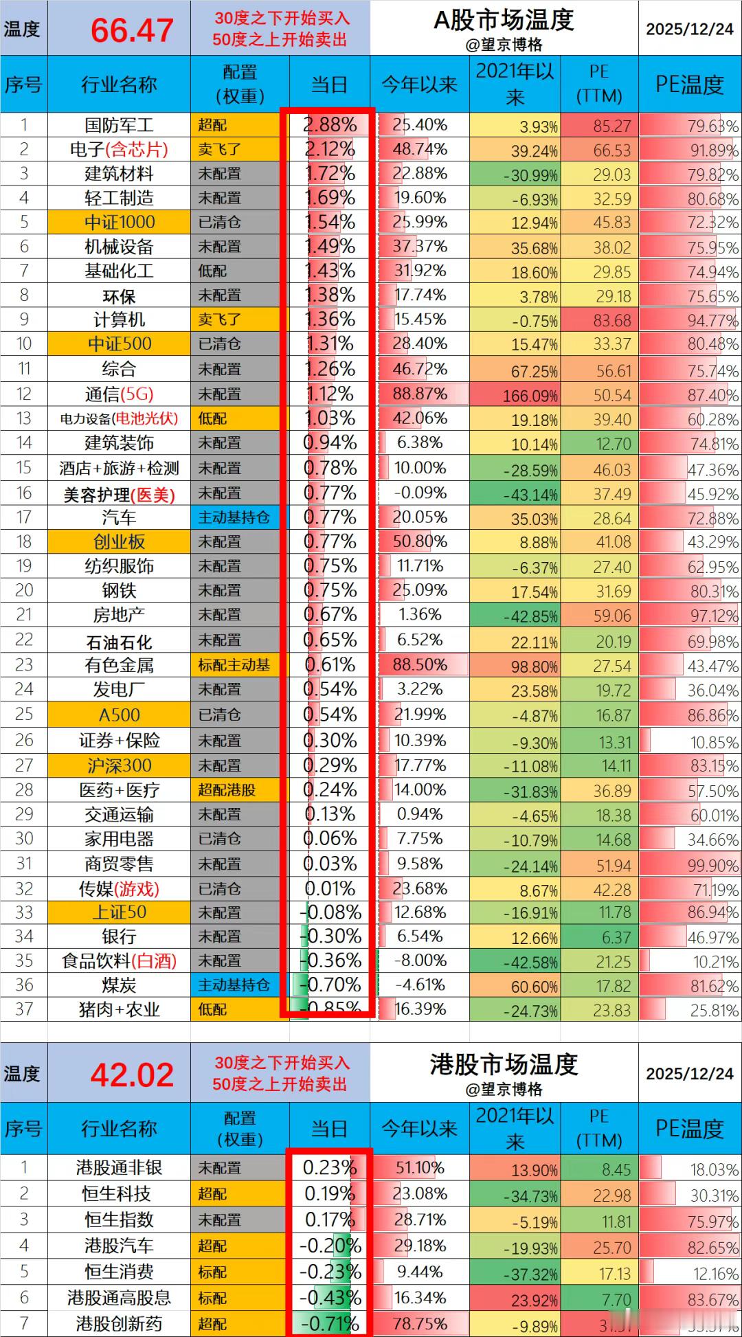 场内ETF账户盈利1.0万(资产260万);场外基金账户盈利1.0万(资产540万);两个账户合计盈利2.0万,收益率0.25%。周一盈利4.7万,周二亏损2.2万,周三盈利2.0万,本周盈利4.5万盈利。卫星ETF又创新高了~按目前的趋势,航空航天与卫星也算是明年潜力赛道之一了。另外,博格私域今天发车了医药汉堡,打算跟港股创新药死磕了。A股今天66.47度,相比上一个交易日上升0.6度;港股今天42.02度,相比上一个交易日降低0.2度;大家今天都赚了多少欢迎留言~祝大家圣诞快乐,感谢点赞与点爱心~基金港股a股