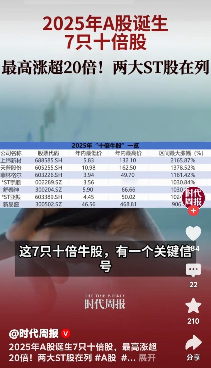 上海证券交易所与深圳证券交易所惊现七匹黑马!2025年A股十倍股神话诞生,最高狂飙超20倍,两大濒死ST股竟逆袭封神! 当绝大多数股民还在为账户里那几个点的波动而焦虑时,2025年的A股市场已经悄然书写了一部令人瞠目结舌的财富传奇。七只股票,宛如七匹脱缰的黑马,在资本的草原上狂奔出了十倍乃至二十倍的惊人涨幅。更让人难以置信的是,这封神榜上,赫然列着两只曾经戴着“ST”帽子的“危重病人”。这不仅仅是数字的游戏,这是一场关于贪婪与恐惧、绝望与重生、认知与运气的深刻人性寓言。 翻开这份沉甸甸的名单,上纬新材超过二十倍的涨幅足以让任何故事都显得苍白。它从一家普通的材料公司,因“智元机器人”的入主而跨界拥抱“具身智能”,瞬间被资本捧上神坛。这哪里是投资,这分明是一场关于未来想象的豪赌。人们买的不是现在的业绩,而是一个科幻般的明天。这种暴涨,深深击中了人性中渴望一夜暴富、押注下一个风口的致命弱点。 同样,天普股份、菲林格尔的传奇,无不与“借壳”、“实控人变更”、“资产注入”这些充满魔力的词汇紧密相连。它们的故事告诉我们,在A股,基本面的剧变往往比缓慢的业绩增长更具爆炸力。这像一剂强心针,让无数在平庸股票中煎熬的投资者心潮澎湃,仿佛看到了那条“乌鸡变凤凰”的捷径就在眼前,尽管这条路上堆满了白骨。 而最刺痛人心,也最引发集体共鸣的,莫过于ST宇顺和ST亚振的逆袭。它们曾是市场的弃儿,股价低迷,无人问津,甚至面临退市的边缘。然而,通过资产重组切入数据中心,或是被矿产巨头看中,它们完成了从地狱到天堂的惊险一跃。这像极了我们的人生,绝处逢生的故事永远最激动人心。它让每一个在低谷中挣扎的人心生幻想:也许,再坚持一下,下一个被命运眷顾的就是我? 但是,朋友,当你为这些神话热血沸腾时,请先摸摸你的胸口,听听那些真实的声音。“买到了也拿不住,还不到翻倍早清仓了”,这是大多数散户的真实写照。信息的不对称、内心的恐惧与贪婪,让我们总是完美地错过主升浪,却牢牢接住下跌的飞刀。“全部是马后炮”,一句道尽了多少无奈与酸楚。我们看到的永远是成功者的盛宴,却忽视了盛宴背后无数沉默的牺牲者。 新易盛的故事似乎“正统”一些,凭借光模块卡位AI算力风口,绑定国际巨头,用业绩和赛道说话。但这恰恰揭示了另一个残酷真相:即便逻辑最硬、前景最明的赛道,能从头吃到尾的,也永远是极少数具备强大研究能力和持股定力的人。对于普通人,更多时候是追高之后的震荡与煎熬。 这七只十倍股,像一面镜子,照出了A股市场的众生相。这里有时代浪潮的馈赠,有资本运作的魔术,有绝地求生的侥幸,更有无数普通人望洋兴叹的财富鸿沟。它们点燃的,是每个人心中那个“如果当时我买了”的致富梦;它们揭示的,是在这个信息纷杂、情绪主导的市场里,独立思考和理性判断是多么稀缺的品质。 盛宴之后,总会杯盘狼藉。ST股的暴涨固然激动人心,但其背后是否暗藏脱离基本面的炒作泡沫?下一个十倍股会花落谁家?是继续在重组神话中寻觅,还是在AI、商业航天、自动驾驶这些高景气赛道中深耕?这留给2026年的,既是一个充满诱惑的问号,也是一面需要时时自省的镜子。 神话很美,但通往神话的道路往往布满荆棘。在心动于那些惊人涨幅的数字之前,或许我们更应该问自己:我真的理解它上涨的逻辑吗?我的心态能承受住巨幅的波动吗?当潮水退去,我是不是那个裸泳的人?投资,最终是一场与自身人性弱点对抗的修行。 (来源:综合自时代周报、东方财富网、同花顺财经等公开市场信息及数据分析) A股传奇 十倍股揭秘