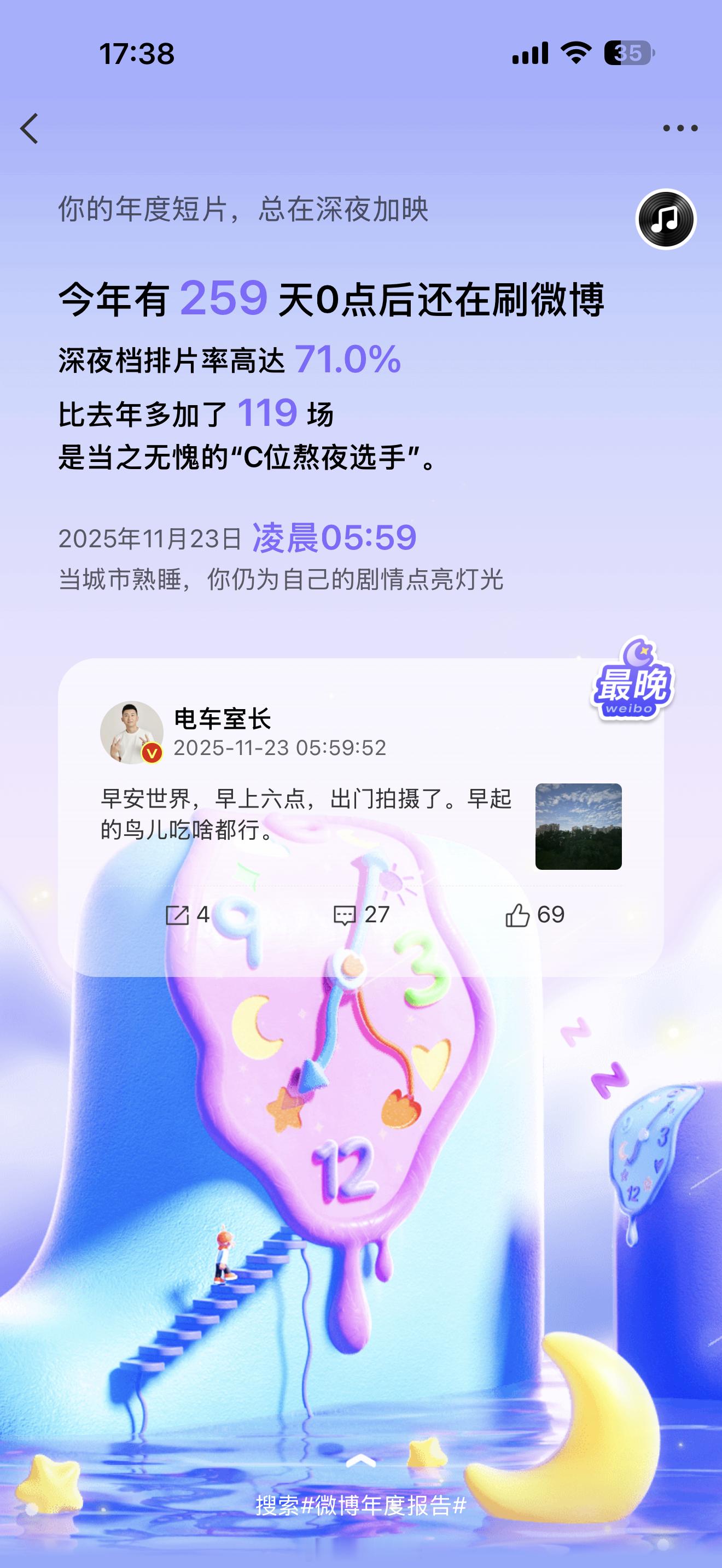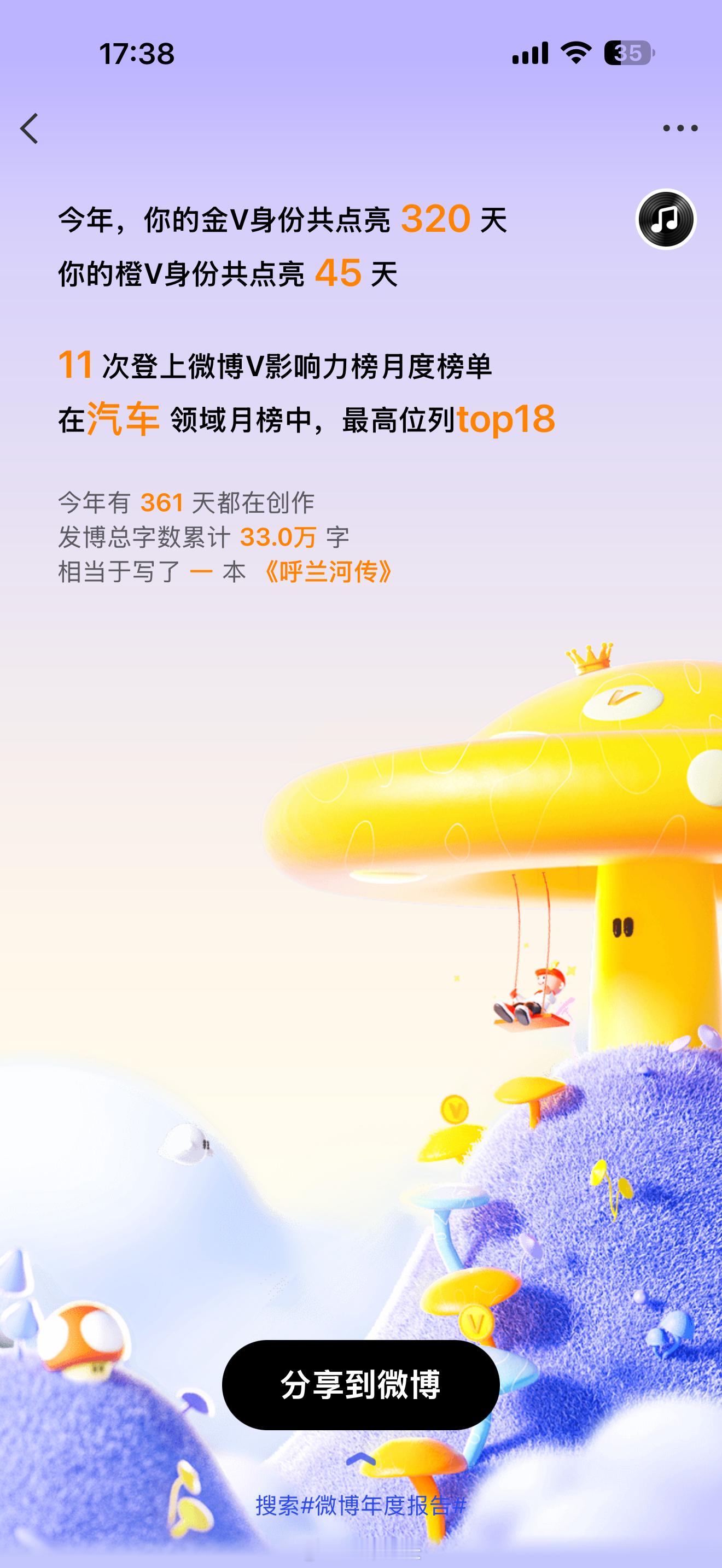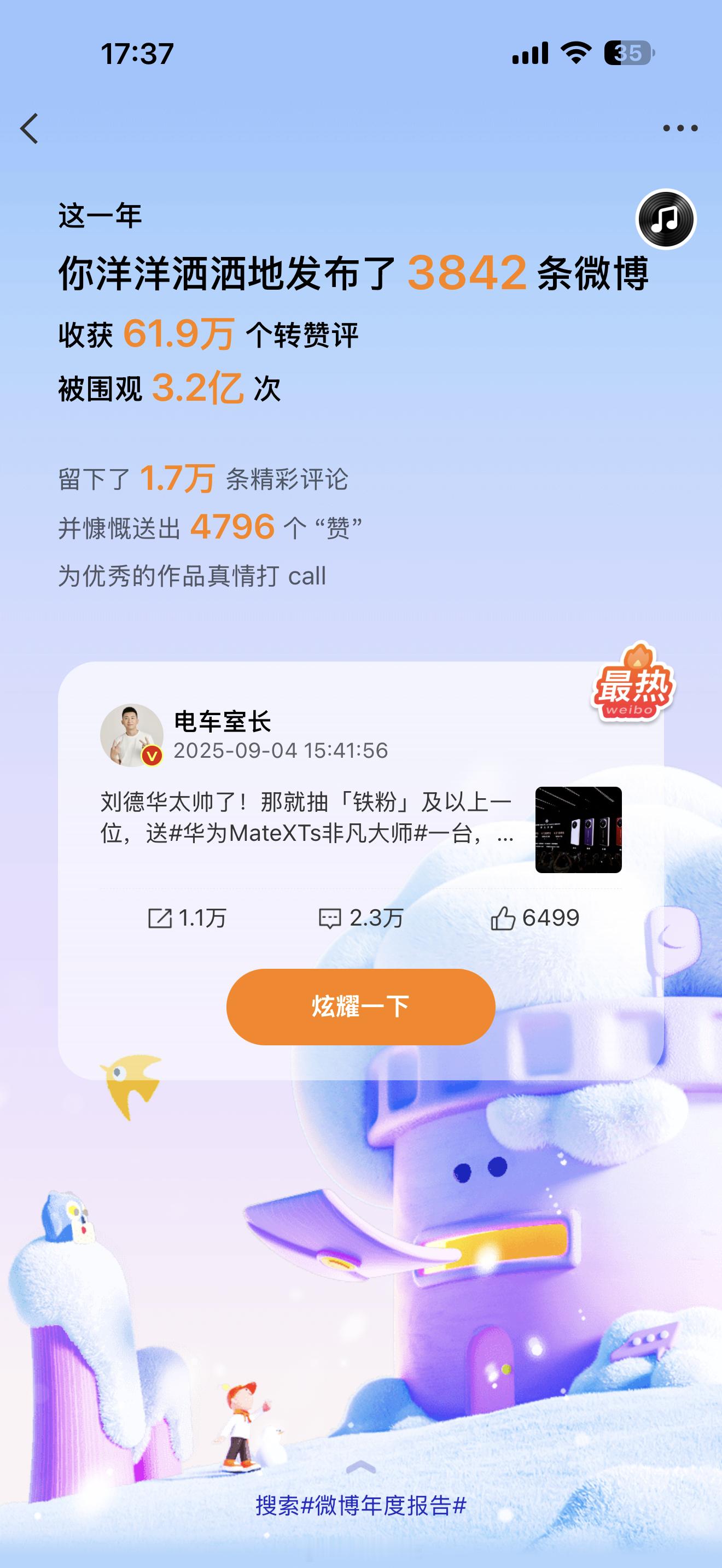 微博年度报告我的2025微博年度报告来了,全勤发布3842条微博,一共发了33万字。每个月都登上了汽车月榜,有259天的0点后还在刷微博。明年阅读量和粉丝量要上一个大台阶