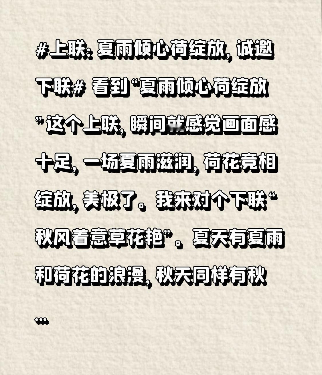 看到“夏雨倾心荷绽放”这个上联,瞬间就感觉画面感十足,一场夏雨滋润,荷花竞相绽放,美极了。我来对个下联“秋风着意草花艳”。夏天有夏雨和荷花的浪漫,秋天同样有秋风和草花的绚丽。秋风轻轻拂过,带着丝丝凉意,草花在它的轻抚下,展现出艳丽的色彩,就像大自然用画笔精心描绘的画卷。而且“秋风”对“夏雨”,季节相对;“着意”对“倾心”,情感呼应;“草花艳”对“荷绽放”,景色相衬,怎么样,我这下联还不错吧!