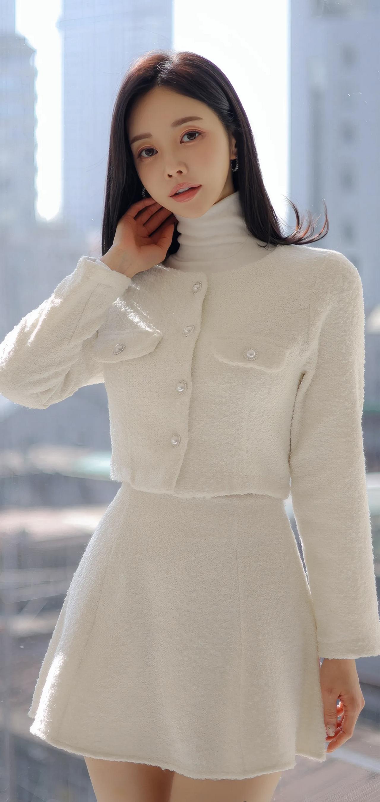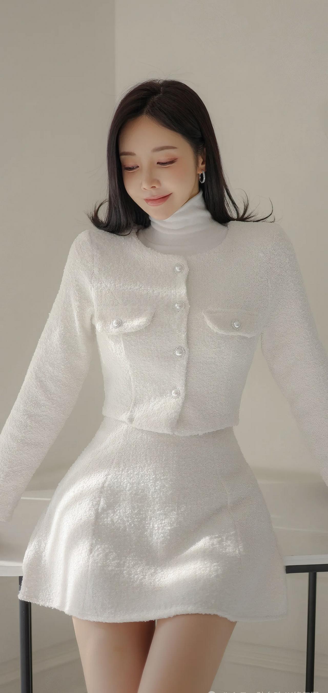 都市时尚女孩,白色高领毛衣裙,优雅气质,城市背景,高跟鞋,完美搭配。