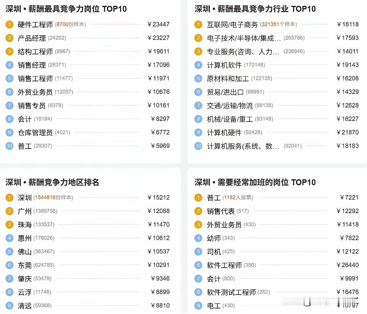 深圳最最赚钱的几个行业,几乎都是和计算机有关,尤其是硬件工程师,随便一个岗位都得两万一个月,毕竟这行业技术要求高,门槛高,然而销售行业的收入也不低,几乎能达到硬件工程师的收入,所以说,销售是很多人翻身的最重要一个行业,门槛低,只要有能力就能赚钱,靠努力吃饭。