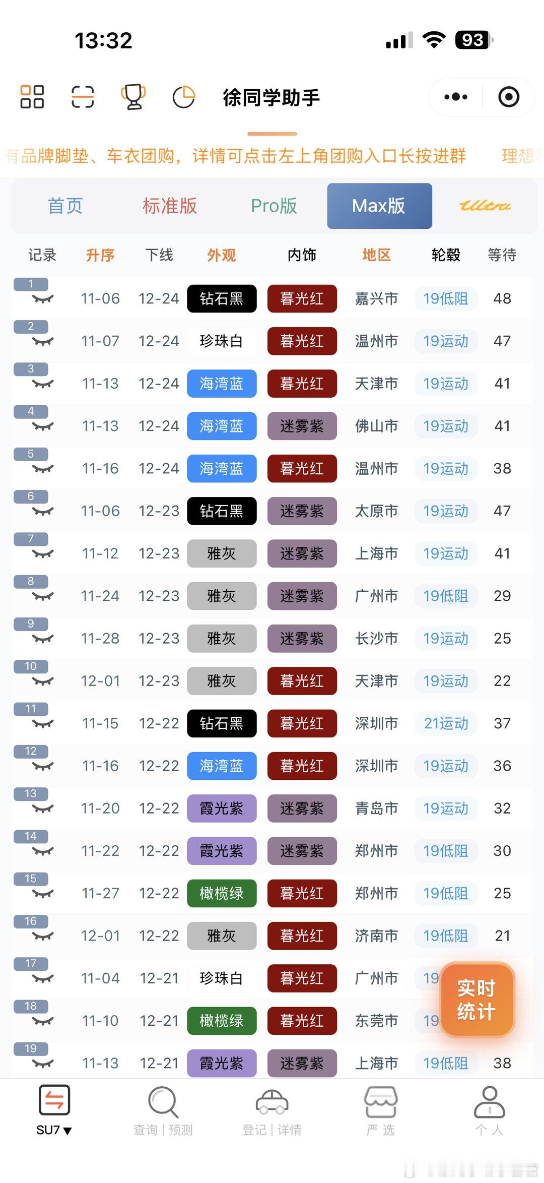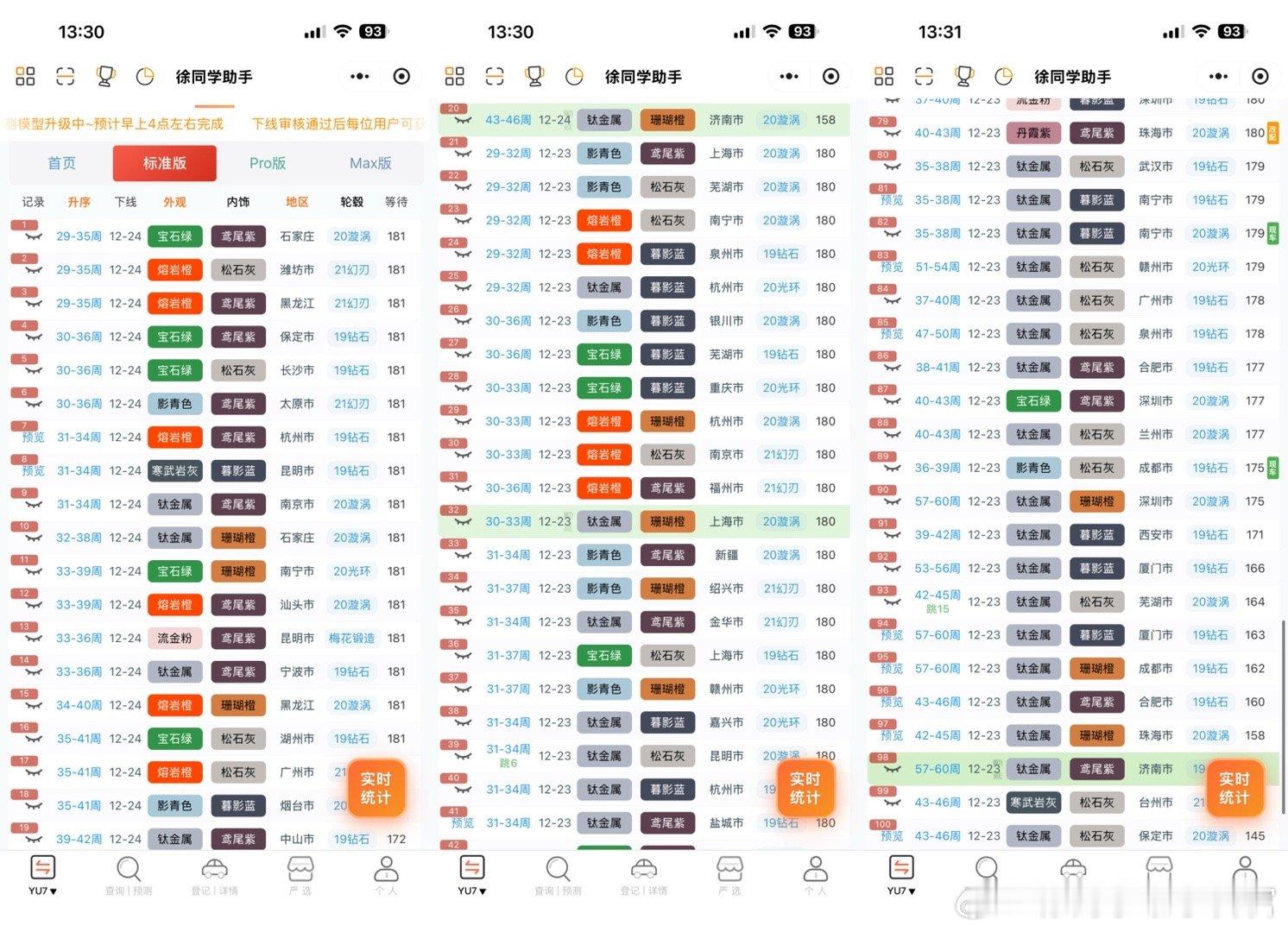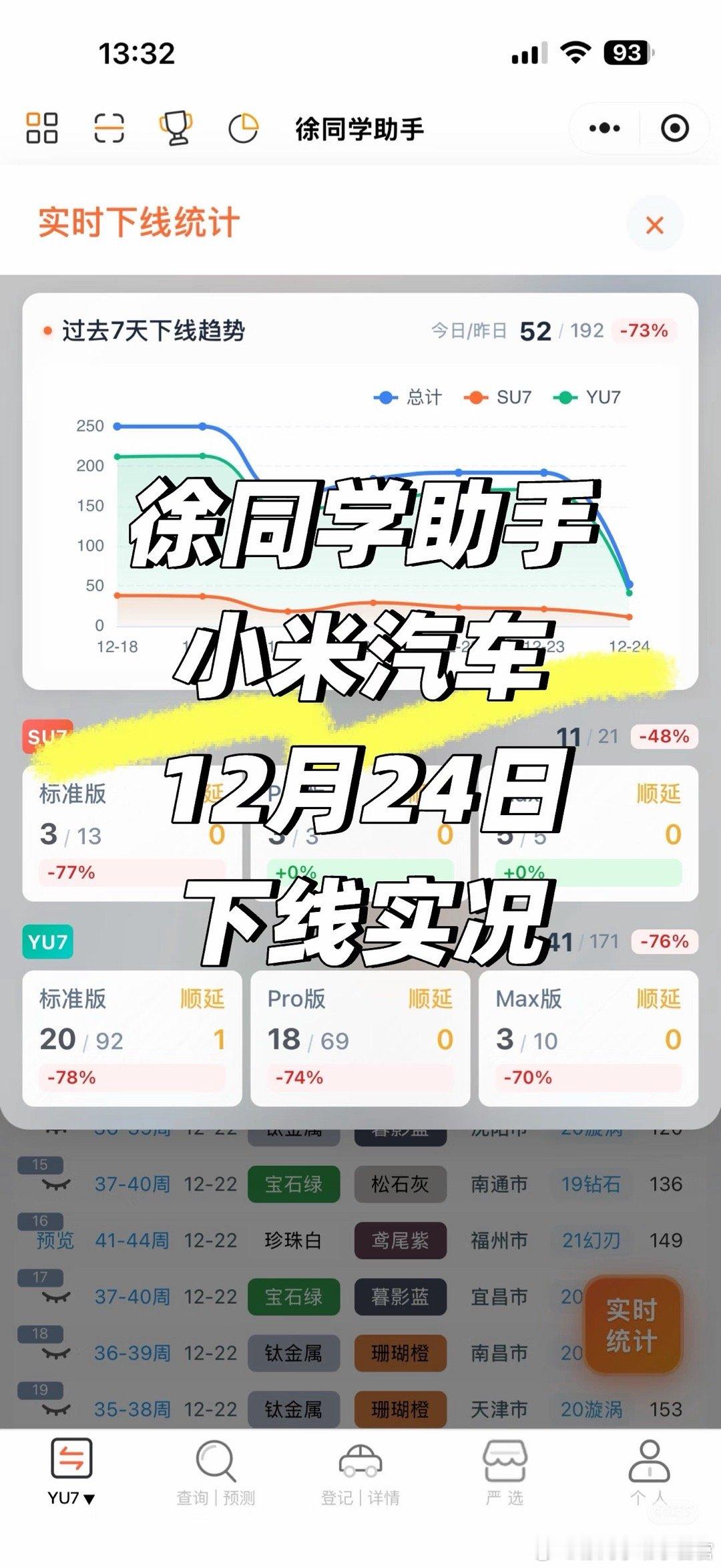 冬季开车:今天寒潮来袭,续航还是很顶,我的max充到80%依旧有450km左右的实际续航。关于续保:前些天给su7max续保,第一年9000多,第二年没出过险(有违章),续了人保6200多,属于官保,仍旧可以买无忧包服务。续保基本上可以在第一年的基础上最少优惠1700明天发布17ultra,可惜没车…‼️不过没产能就不发新车,这次小米听劝了🌀YU7(据不完全统计)合计171台1️⃣标准:下线92台,基本都是在下30周之后的,跳周后剩余的周数都在39周左右2️⃣Pro:下线69台台,26号之后的开始多起来了,春节前还能交付很多3️⃣Max:下线10台,现车还有最后一天关于跳周现车改配活动结束后可能会迎来跳周更多关于小米汽车的最新资讯和深度解析,请参考【米车派】~徐同学助手小米汽车