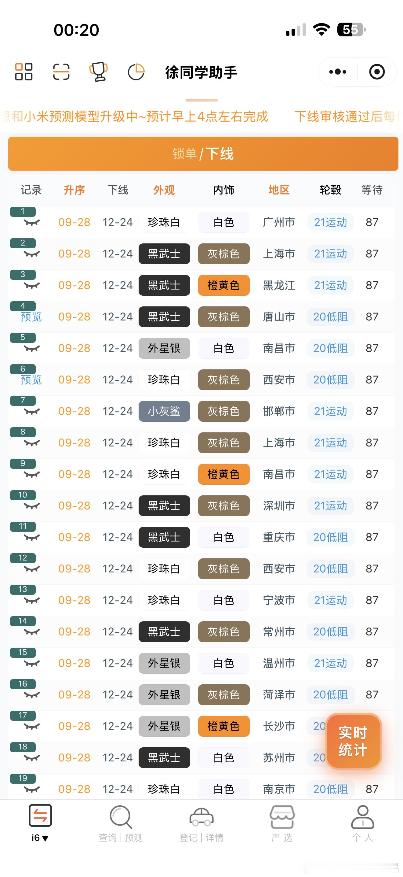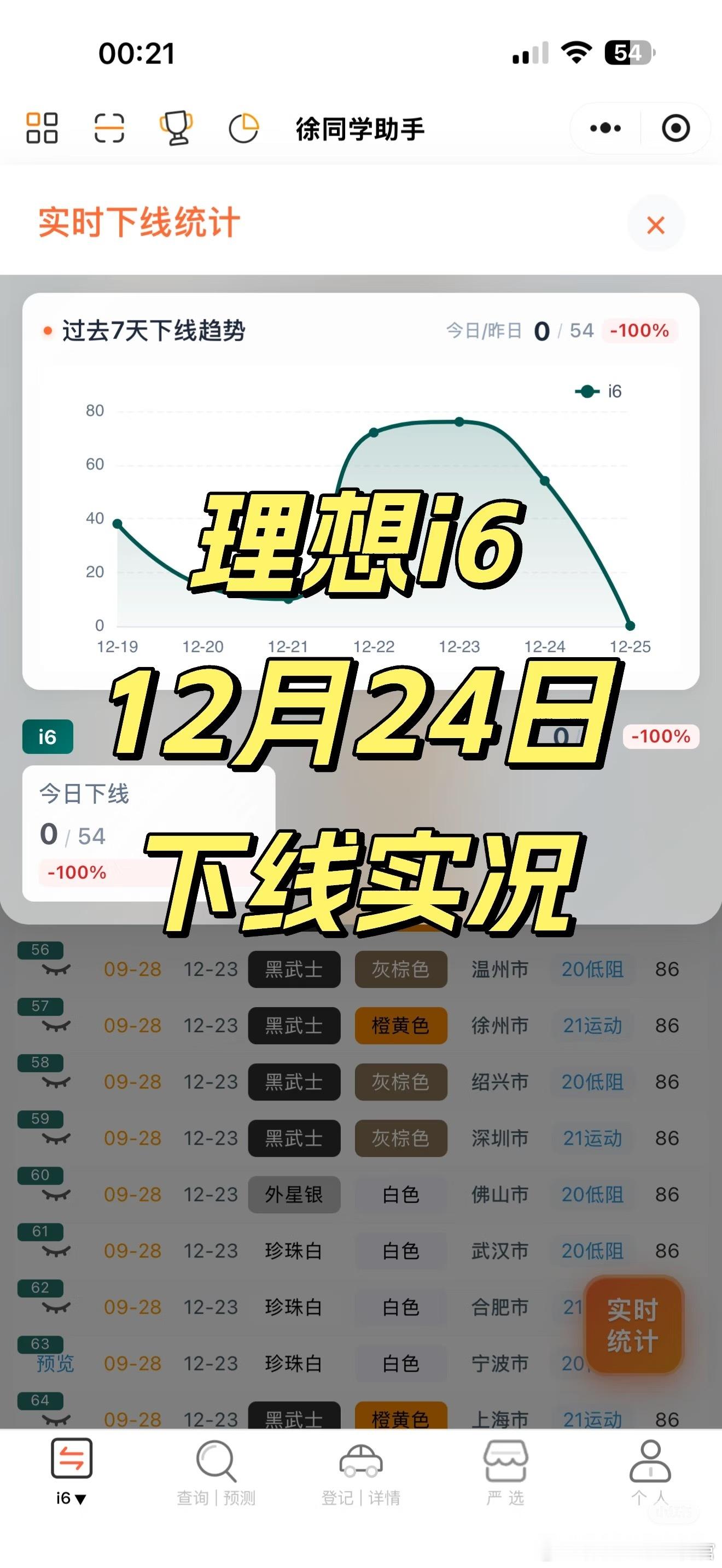 理想i6(12月24日)下线实况📈徐同学助手今日统计下线54台,这个数据会持续增长(图2-图4)1️⃣今日下线以28日下午为主(等待初始11-13周)2️⃣集中分布于15:00-20:003️⃣不少车主在下午或晚上收到了下线通知。‼️据某【供应商】消息,各类配件正常供应,工厂或有调整,但是未有停产举措只是近期的下线通知集中在下午及晚上,可以在等车界面自行查看状态(可能有意外收获哦)惊喜‼️28日订单近两日有部分车主收到了延迟下线通知,但是有些突然显示【生产完成】,可以多刷一下查看下线订单或者预测交付时间请参考【徐同学助手】🍊徐同学助手理想汽车理想i6汽场全开