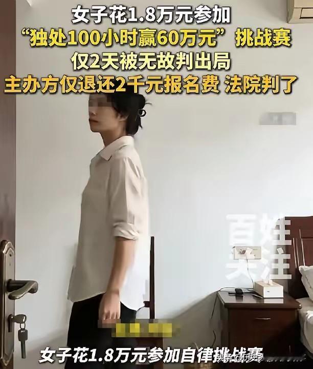 1.8万换60万?成都女子“独处挑战”48小时遭出局,法院:协议无效,全额退款! “独处100小时赢60万”的“自律挑战”,看似诱人,实则暗藏陷阱。近日四川自贸区法院审结的一起案件,撕开了这类“高回报挑战”的真面目。 2024年9月,成都女生小米支付1.8万元报名费,与某传媒公司签约“独处100小时”挑战,承诺遵守禁手机、全程监控等严苛规则,完成可获60万奖金并退还报名费 。然而挑战仅48小时,她就被无故判出局,主办方拒绝说明理由,仅退2000元 。 小米愤而起诉。法院审理认为,该协议以高额奖金为诱饵,本质是射幸行为,违背诚信敬业的价值观;且协议为单方制定的“霸王条款”,权利义务严重失衡,属于无效格式条款 。最终判决主办方全额退还1.8万元报名费,60万奖金诉求不予支持 。 此类“高风险、高回报”挑战多为营销噱头,切勿轻信“不劳而获”,签约前务必审查条款,遭遇不公及时维权。 素材来源于网络,侵权删除。