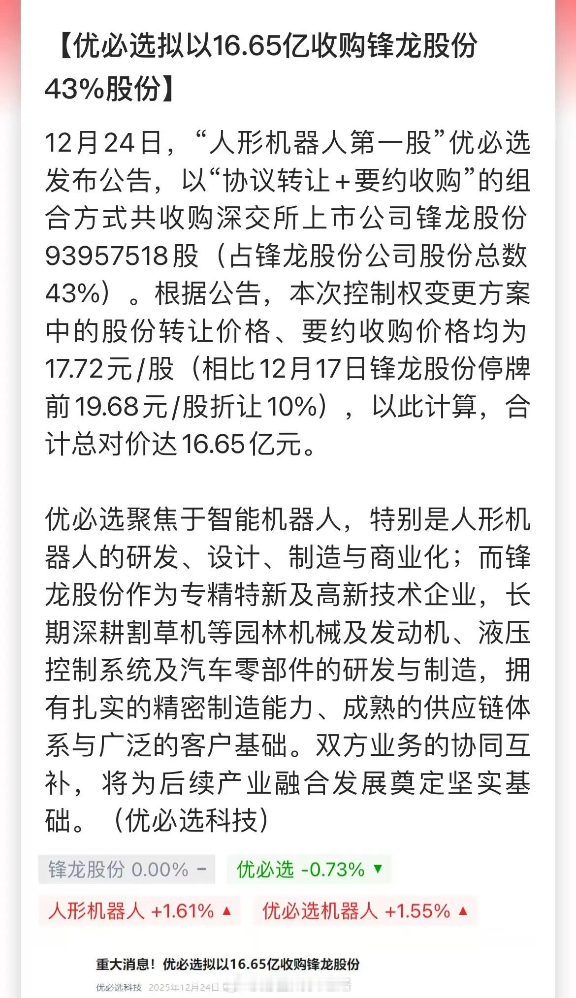 优必选是国内机器人第一股,但在港股不怎么受待见,市值550亿港元,高位下来跌了70%!现在花了16.65亿拿下A股锋龙股份43%的股份,此次收购或借壳返回A股,这是要狙击宇树科技啊。回A股不得炒到千亿以上,2000~3000亿也是有可能的。锋龙股份会不是下一个上纬新材?公司1.74万股东估计要睡不着。明天开始数板的节奏,这是中了一张大彩票了。优必选相关的概念股,比如合作方,参股方等等,估计也会被炒一炒。今晚小表格挺多的,这个供大家参考吧: