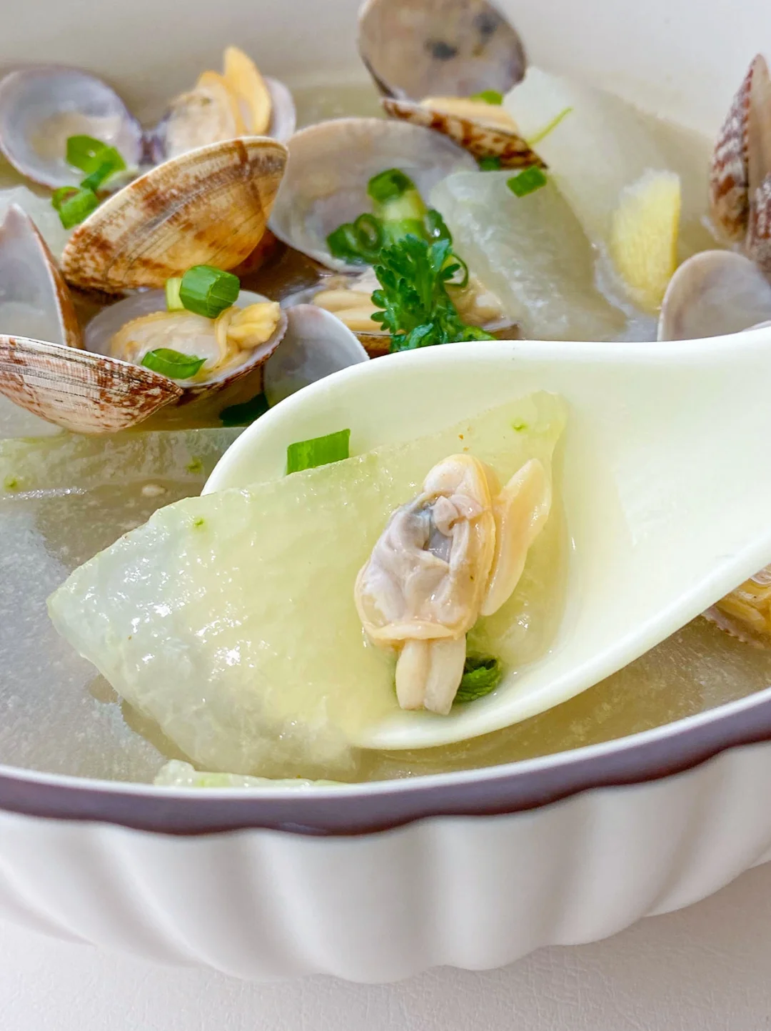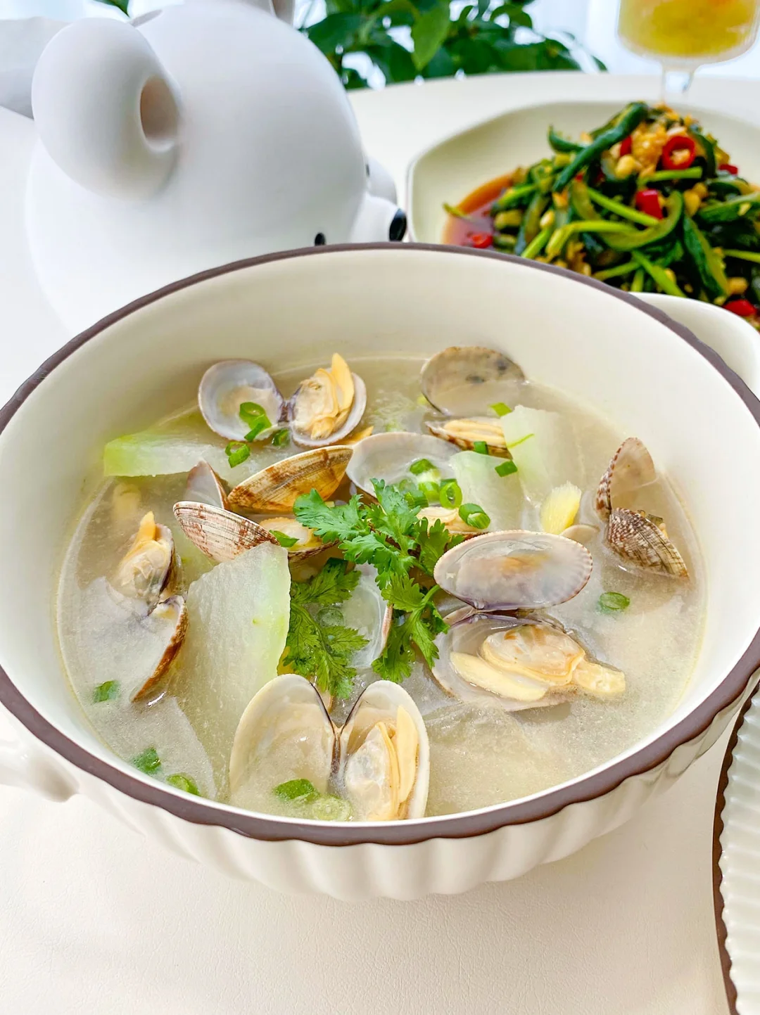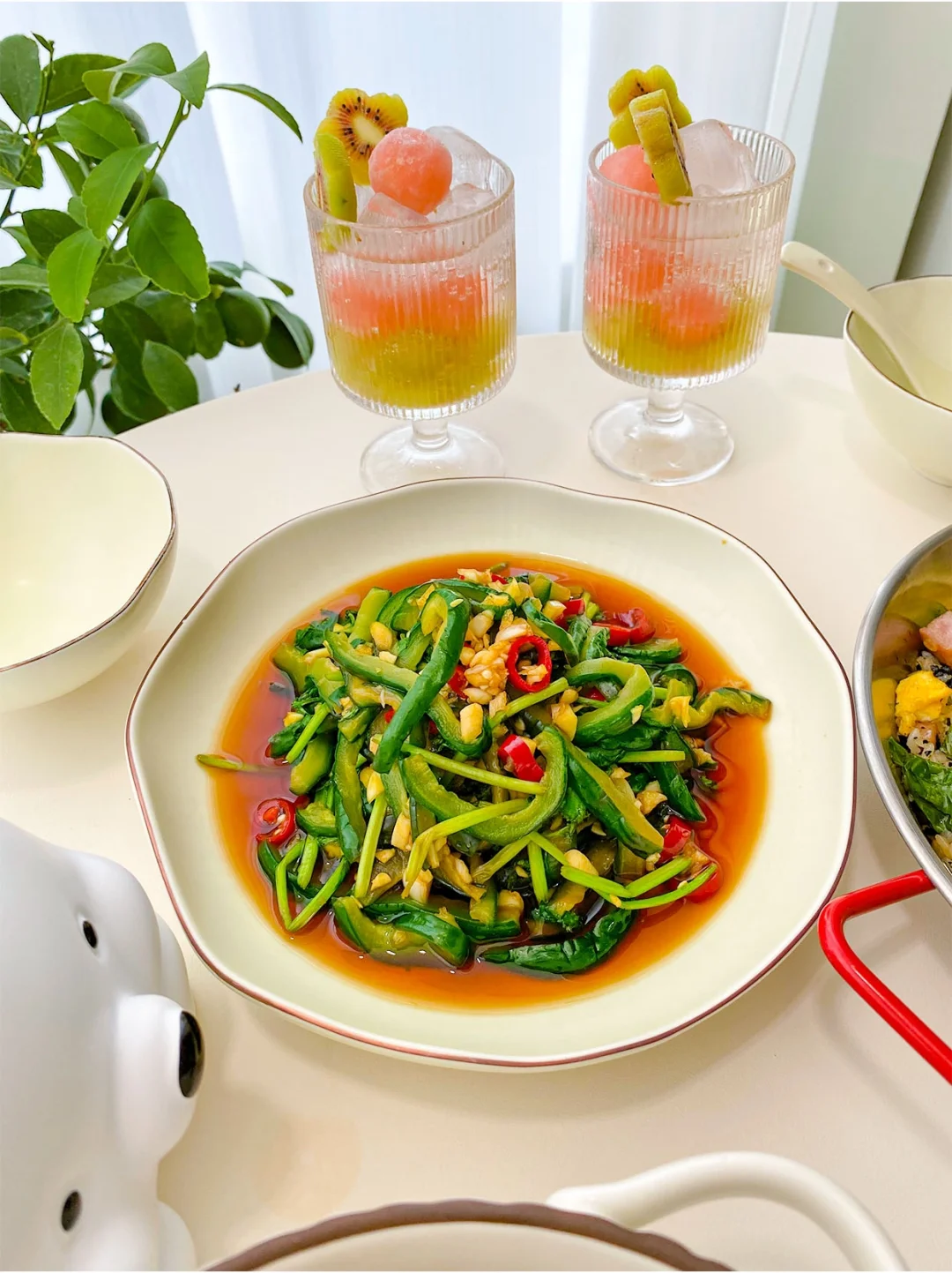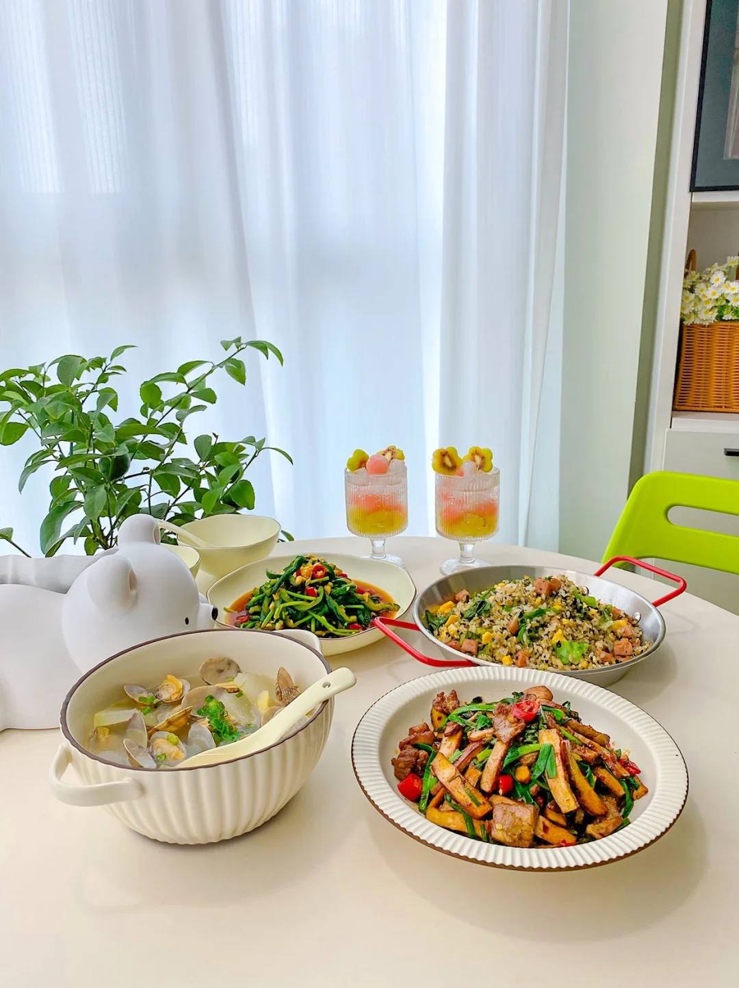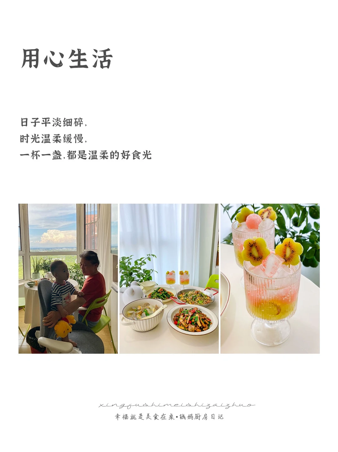今日菜单🥣: 1⃣️紫菜炒饭 2⃣️香干炒肉 3⃣️冬瓜蛤蜊汤 4⃣️酸辣黄瓜条 所有菜品做法见图片 碎碎念🌈: 紫菜炒饭也太好吃了,搭配酸辣黄瓜条,炫不停,再喝一口冬瓜蛤蜊汤,太舒服了。 香干炒肉是今天的蛋白质担当~ 今天的饮料颜值很高又好喝很喜欢~, 做法:葡萄打底,加冰块、桃子冰,浇入气泡水,用模具切一个猕猴桃花花装饰,猕猴桃花花太好看啦。 日子平淡细碎 时光温柔缓慢 一杯一盏,都是温柔的好时光
