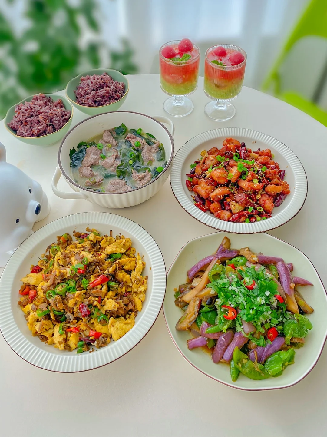 1⃣️番茄牛腩+香辣凤爪+韭黄鸡蛋+拍黄瓜 2⃣️柠香鸡翅+清炒南瓜尖+辣椒炒腊肉+西红柿鸡蛋 3⃣️水煮肉片+什锦虾仁+茭白牛肉+麻婆豆腐 4⃣️红烧鲈鱼+大虾炖冬瓜+山药牛肉汤+凉拌粉丝 5⃣️番茄鸡蛋米粉+煎梅花肉+白灼油麦菜 6⃣️ 辣子鸡+外婆菜炒鸡蛋+辣椒炒茄子+裙带菜牛肉汤 7⃣️ 烤猪蹄+麻辣小龙虾+苦瓜炒鸡蛋+酸辣土豆丝 所有菜品做法见主页每天笔记哈~