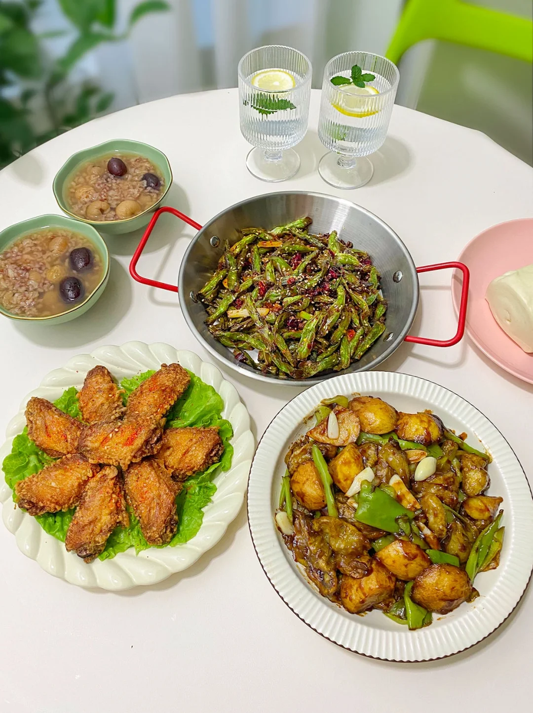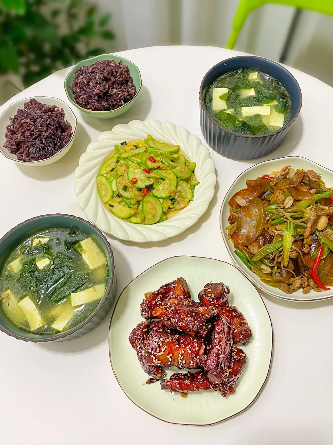 1⃣️蒜香鸡翅+山药玉米排骨汤+沙葱炒鸡蛋+炝拌黄 2⃣️干煸豆角+五香鸡翅+地三鲜+八宝粥 3⃣️豆角炖肉+干锅土豆片+胡萝卜炒蛋+清炒菜心 4⃣️葱爆猪肝+炒韭菜苔+清炒瓠子+山药芙蓉汤 5⃣️香辣烤鱼+手撕茄子+炝拌毛豆 6⃣️糖醋排骨+炒杂菜+炒西葫芦+裙带菜豆腐 7⃣️卤牛腱子+菠菜鸡蛋+蒜蓉西兰花+水果拼盘
